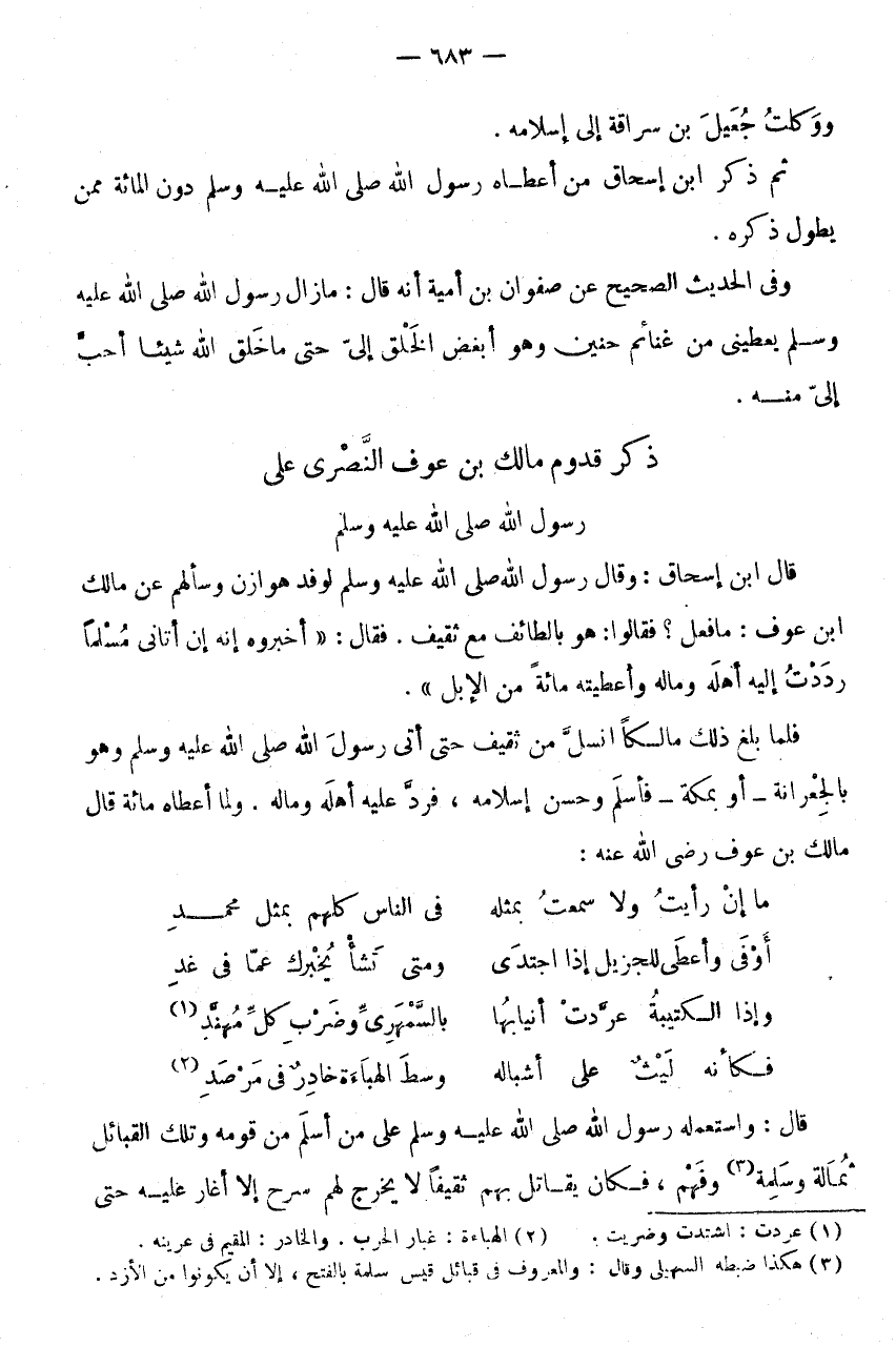 وَلما أعطَاهُ مائَة قَالَ مَالِكُ بْنُ عَوْفٍ رَضِيَ اللَّهُ عَنْهُ: مَا إِنْ رَأَيْتُ وَلَا سَمِعْتُ بِمِثْلِهِ * فِي النَّاسِ كُلِّهِمُ بِمِثْلِ مُحَمَّدِ أَوْفَى وَأَعْطَى لِلْجَزِيلِ إِذَا اجْتُدِي * وَمَتَى تَشَأْ يُخْبِرْكَ عَمَّا فِي غَدِ وَإِذَا الْكَتِيبَةُ عَرَّدَتْ أَنْيَابُهَا * بِالسَّمْهَرِيِّ وَضَرْبِ كُلِّ مُهَنَّدِ (1)