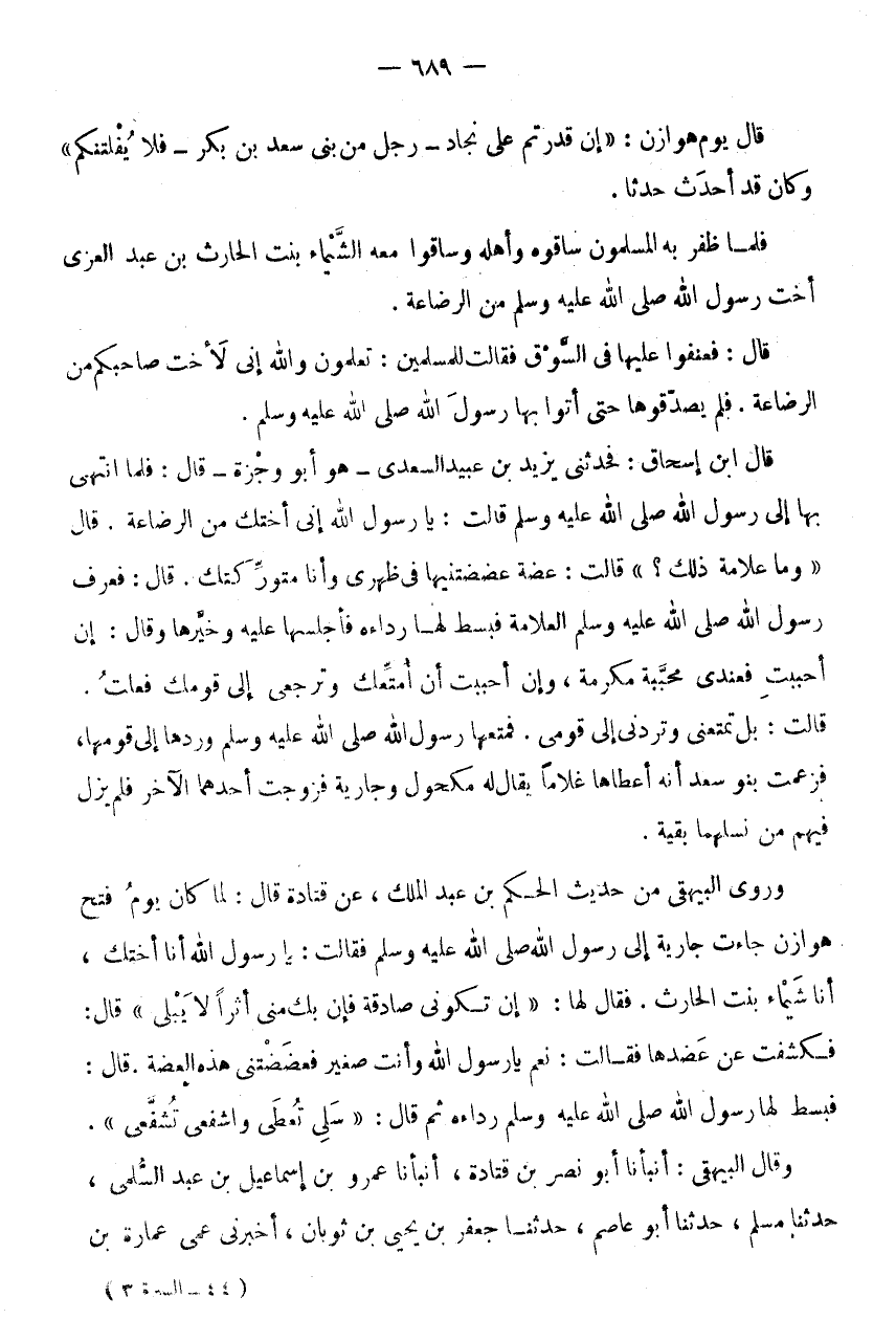 فَلَمَّا ظَفِرَ بِهِ الْمُسْلِمُونَ سَاقُوهُ وَأَهْلَهُ وَسَاقُوا مَعَهُ الشَّيْمَاءَ بِنْتَ الْحَارِثِ بْنِ عَبْدِ الْعُزَّى أُخْتَ رَسُولِ اللَّهِ صَلَّى اللَّهُ عَلَيْهِ وَسَلَّمَ مِنَ الرَّضَاعَةِ.
