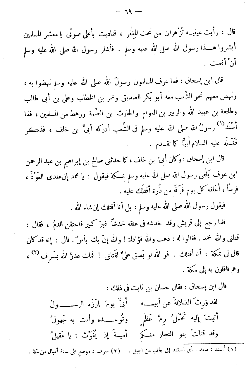 قَالَ ابْنُ إِسْحَاقَ: فَلَمَّا عَرَفَ الْمُسْلِمُونَ رَسُولَ اللَّهِ صَلَّى اللَّهُ عَلَيْهِ وَسَلَّمَ نَهَضُوا بِهِ، وَنَهَضَ مَعَهُمْ نَحْوُ الشِّعْبِ مَعَهُ أَبُو بَكْرٍ الصَّدِّيقُ وَعُمَرُ بْنُ الْخَطَّابِ وَعَلِيُّ بْنُ أَبِي طَالِبٍ وَطَلْحَةَ بْنِ عُبَيْدِ اللَّهِ وَالزُّبَيْرِ بْنِ الْعَوَّامِ وَالْحَارِثُ بْنُ الصِّمَّةِ وَرَهْطٌ مِنَ الْمُسْلِمِينَ، فَلَمَّا أُسْنِدَ (1) رَسُولُ اللَّهِ صَلَّى اللَّهُ عَلَيْهِ وَسَلَّمَ فِي الشِّعْبِ أَدْرَكَهُ أُبَيُّ بن خلف، فَذكر قَتله عَلَيْهِ السَّلَام أُبَيًّا كَمَا تَقَدَّمَ.