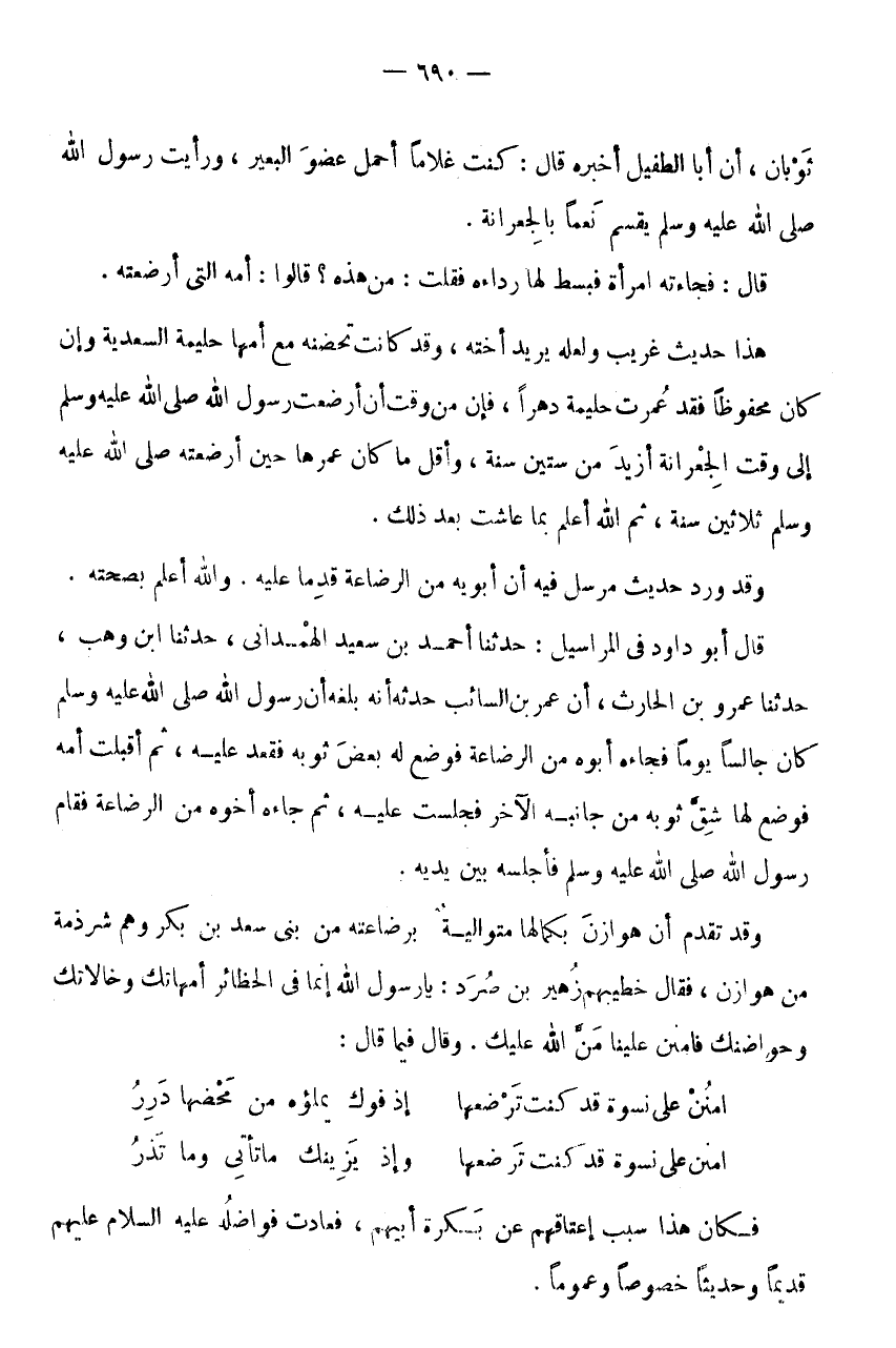 وَقَالَ فِيمَا قَالَ: امْنُنْ عَلَى نِسْوَةٍ قَدْ كُنْتَ تَرْضَعُهَا * إِذْ فُوكَ يَمْلَؤُهُ مِنْ مَحْضِهَا دِرَرُ امْنُنْ عَلَى نِسْوَةٍ قَدْ كُنْتَ تَرْضَعُهَا * وَإِذْ يَزِينُكَ مَا تَأْتِي وَمَا تذر فَكَانَ هَذَا سَبَب إعتاقهم من بكرَة أَبِيهِم، فَعَادَت فواضله عَلَيْهِ السَّلَام عَلَيْهِمْ قَدِيمًا وَحَدِيثًا خُصُوصًا وَعُمُومًا.
