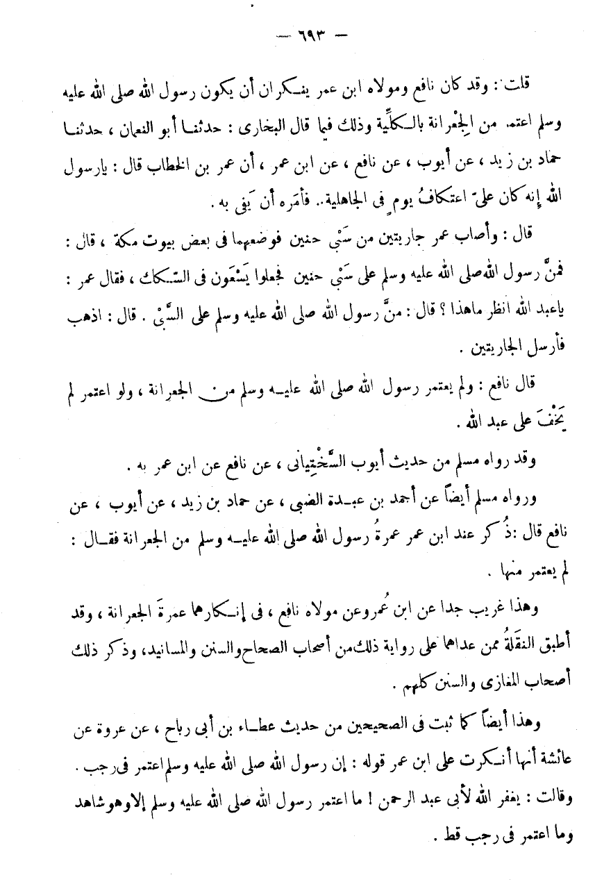 قُلْتُ: وَقَدْ كَانَ نَافِعٌ وَمَوْلَاهُ ابْنُ عُمَرَ يُنْكِرَانِ أَنْ يَكُونَ رَسُولُ اللَّهِ صَلَّى اللَّهُ عَلَيْهِ وَسَلَّمَ اعْتَمَرَ مِنَ الْجِعْرَانَةِ بِالْكُلِّيَّةِ وَذَلِكَ فِيمَا قَالَ البُخَارِيّ: حَدثنَا أَبُو النُّعْمَان، حَدَّثَنَا حَمَّادُ بْنُ زَيْدٍ، عَنْ أَيُّوبَ، عَنْ نَافِعٍ، عَنِ ابْنِ عُمَرَ، أَنَّ عُمَرَ بْنَ الْخَطَّابِ قَالَ: يَا رَسُولَ اللَّهِ إِنَّهُ كَانَ عَلَيَّ اعْتِكَافُ يَوْمٍ فِي الْجَاهِلِيَّةِ..فَأَمَرَهُ أَنْ يَفِيَ بِهِ.