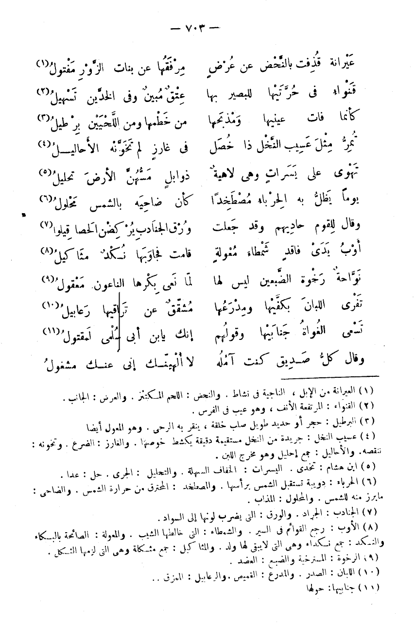 عَيْرَانَةٌ قُذِفَتْ بِالنَّحْضِ عَنْ عُرُضٍ * مِرْفَقُهَا عَنْ بَنَاتِ الزَّوْرِ مَفْتُولُ (1) قَنْوَاءُ فِي حُرَّتَيْهَا لِلْبَصِيرِ بهَا * عتق مُبين وفى الْخَدين تسهيل (2)
