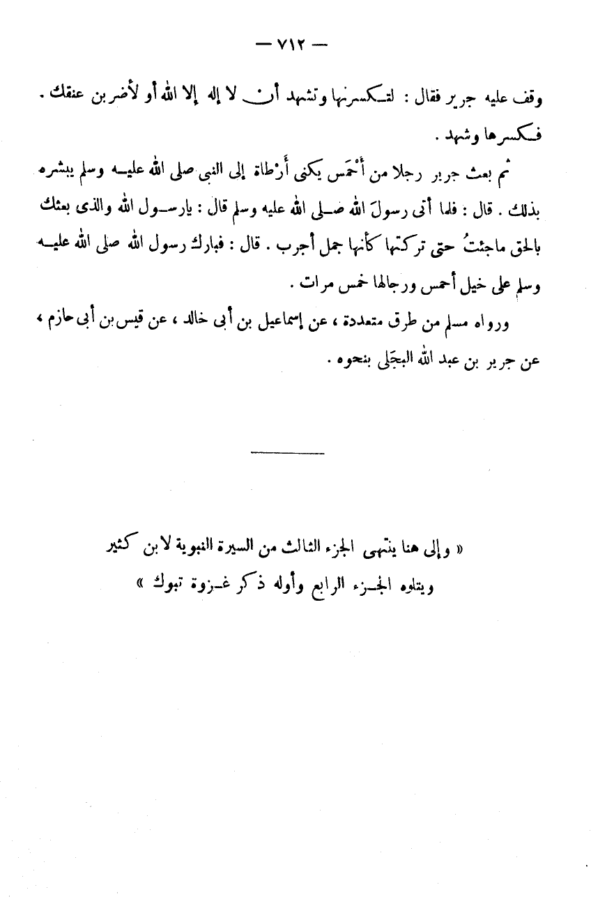 " وَإِلَى هُنَا ينتهى الْجُزْء الثَّالِث من السِّيرَة النَّبَوِيَّة لِابْنِ كثير