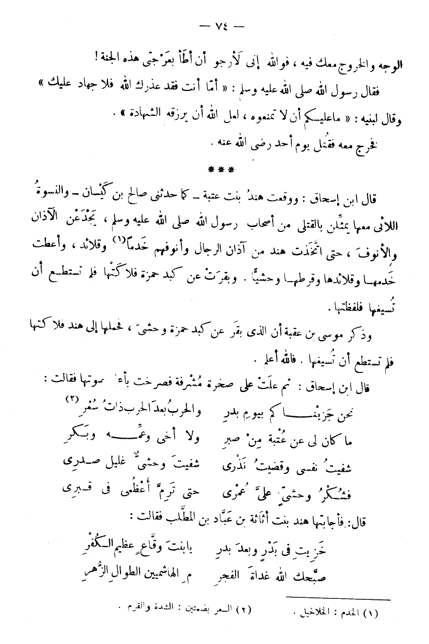 * * * قَالَ ابْنُ إِسْحَاقَ: وَوَقَعَتْ هِنْدُ بِنْتُ عُتْبَةَ - كَمَا حَدَّثَنِي صَالِحُ بْنُ كَيْسَانَ - وَالنِّسْوَةُ اللَّائِي مَعَهَا يُمَثِّلْنَ بِالْقَتْلَى مِنْ أَصْحَابِ رَسُولِ اللَّهِ صَلَّى اللَّهُ عَلَيْهِ وَسلم، يجد عَن الْآذَانَ وَالْأُنُوفَ، حَتَّى اتَّخَذَتْ هِنْدُ مِنْ آذَانِ الرِّجَالِ وَأُنُوفِهِمْ خَدَمًا (1) وَقَلَائِدَ، وَأَعْطَتْ خَدَمَهَا وَقَلَائِدَهَا وقرطها وَحْشِيًّا.