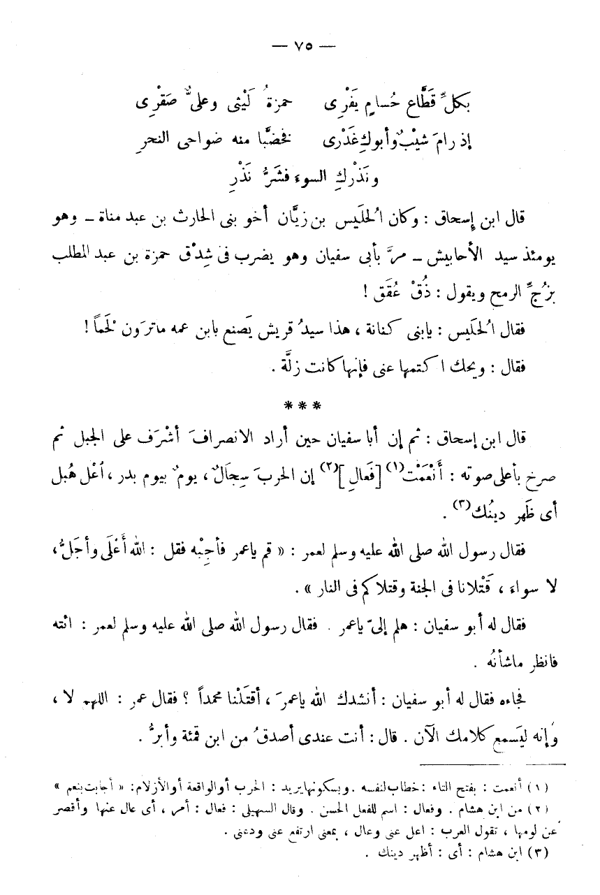 قَالَ ابْن إِسْحَاق: وَكَانَ الْحُلَيْس بن زيان أَخُو بَنِي الْحَارِثِ بْنِ عَبْدِ مَنَاةَ - وَهُوَ يَوْمَئِذٍ سَيِّدُ الْأَحَابِيشِ - مَرَّ بِأَبِي سُفْيَانَ وَهُوَ يَضْرِبُ فِي شِدْقِ حَمْزَةَ بْنِ عَبْدِ الْمُطَّلِبِ بِزُجِّ الرُّمْحِ وَيَقُولُ: ذُقْ عُقَقُ! فَقَالَ الْحُلَيْسُ: يَا بَنِي كِنَانَةَ، هَذَا سَيِّدُ قُرَيْشٍ يَصْنَعُ بِابْنِ عَمِّهِ مَا تَرَوْنَ لَحْمًا! فَقَالَ: وَيْحَكَ اكْتُمْهَا عَنِّي فَإِنَّهَا كَانَتْ زَلَّةً.