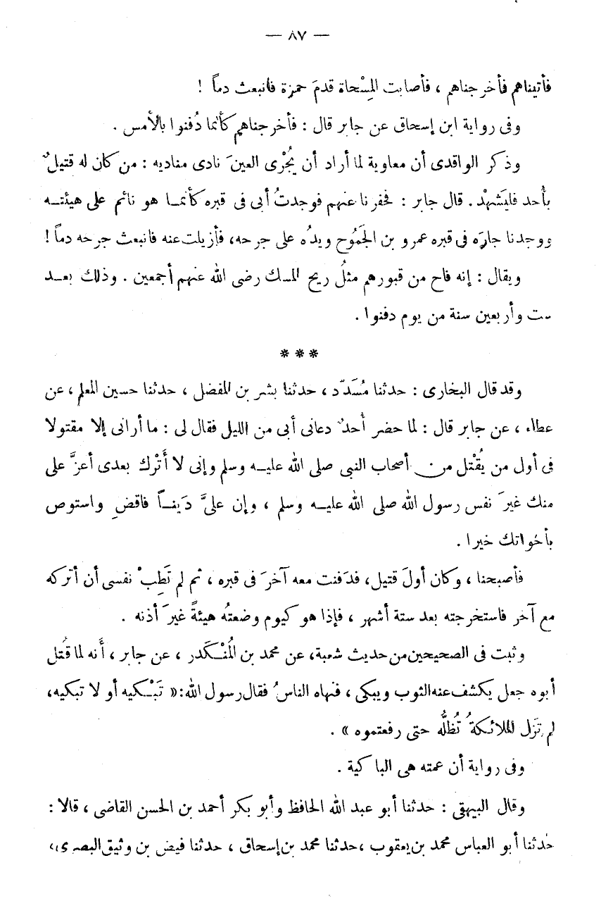 قَالَ جَابِرٌ: فَحَفَرْنَا عَنْهُمْ فَوَجَدْتُ أَبِي فِي قَبْرِهِ كَأَنَّمَا هُوَ نَائِمٌ عَلَى هَيْئَتِهِ وَوجدنَا جَارَهُ فِي قَبْرِهِ عَمْرَو بْنَ الْجَمُوحِ وَيَدُهُ عَلَى جُرْحِهِ، فَأُزِيلَتْ عَنْهُ فَانْبَعَثَ جُرْحُهُ دَمًا! وَيُقَالُ: إِنَّهُ فَاحَ مِنْ قُبُورِهِمْ مِثْلُ رِيحِ الْمِسْكِ رَضِيَ اللَّهُ عَنْهُمْ أَجْمَعِينَ.