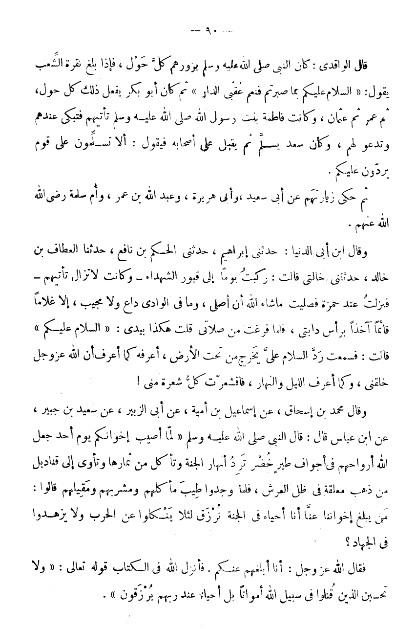 قَالَ الْوَاقِدِيُّ: كَانَ النَّبِيُّ صَلَّى اللَّهُ عَلَيْهِ وَسلم يزورهم كل حول، فَإِذا بلغ نقرة الشِّعْبَ يَقُولُ: " السَّلَامُ عَلَيْكُمْ بِمَا صَبَرْتُمْ فَنِعْمَ عُقْبَى الدَّارِ " ثُمَّ كَانَ أَبُو بَكْرٍ يَفْعَلُ ذَلِكَ كُلَّ حَوْلٍ، ثُمَّ عُمَرُ ثُمَّ عُثْمَانُ، وَكَانَتْ فَاطِمَةُ بِنْتُ رَسُولِ اللَّهِ صَلَّى اللَّهُ عَلَيْهِ وَسَلَّمَ تَأْتِيهِمْ فَتَبْكِي عِنْدَهُمْ وَتَدْعُو لَهُمْ، وَكَانَ سَعْدٌ يُسَلِّمُ ثُمَّ يُقْبِلُ عَلَى أَصْحَابِهِ فَيَقُولُ: أَلَّا تُسَلِّمُونَ عَلَى قَوْمٍ يَرُدُّونَ عَلَيْكُمْ.