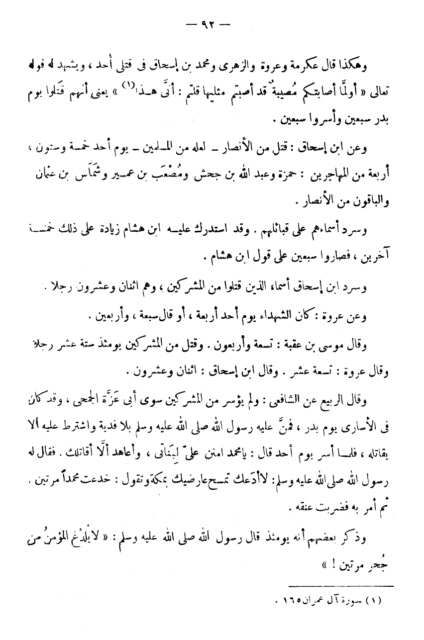 وَعَنِ ابْنِ إِسْحَاقَ: قُتِلَ مِنَ الْأَنْصَارِ - لَعَلَّه من الْمُسلمين - يَوْم أحد خَمْسَةٌ وَسِتُّونَ، أَرْبَعَةٌ مِنَ الْمُهَاجِرِينَ: حَمْزَةُ وَعَبْدُ اللَّهِ بْنُ جَحْشٍ وَمُصْعَبُ بْنُ عُمَيْرٍ وَشَمَّاسُ بْنُ عُثْمَانَ وَالْبَاقُونَ مِنَ الْأَنْصَارِ.