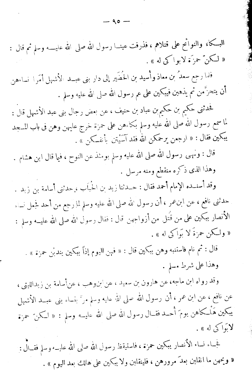 وَقَدْ أَسْنَدَهُ الْإِمَامُ أَحْمَدُ فَقَالَ: حَدَّثَنَا زَيْدُ بْنُ الْحُبَابِ، حَدَّثَنِي أُسَامَةُ بْنُ زَيْدٍ، حَدَّثَنِي نَافِعٍ، عَنِ ابْنِ عُمَرَ، أَنَّ رَسُولَ اللَّهِ صَلَّى اللَّهُ عَلَيْهِ وَسَلَّمَ لَمَّا رَجَعَ مِنْ أُحُدٍ فَجَعَلَ نِسَاءُ الْأَنْصَارِ يَبْكِينَ عَلَى مَنْ قُتِلَ مِنْ أَزْوَاجِهِنَّ قَالَ: فَقَالَ رَسُولُ اللَّهِ صَلَّى اللَّهُ عَلَيْهِ وَسَلَّمَ: " وَلَكِنَّ حَمْزَةَ لَا بِوَاكِيَ لَهُ ".