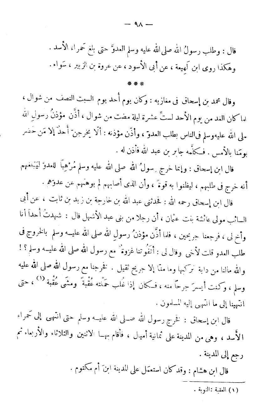 قَالَ: وَطَلَبَ رَسُولُ اللَّهِ صَلَّى اللَّهُ عَلَيْهِ وَسَلَّمَ الْعَدُوَّ حَتَّى بَلَغَ حَمْرَاءَ الْأَسَدِ.