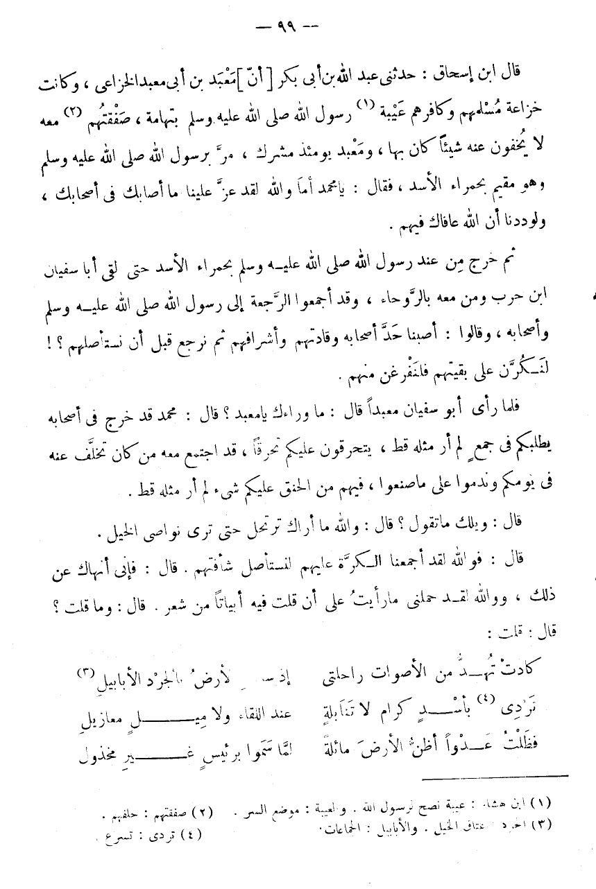 ثمَّ خَرَجَ مِنْ عِنْدَ رَسُولِ اللَّهِ صَلَّى اللَّهُ عَلَيْهِ وَسَلَّمَ بِحَمْرَاءِ الْأَسَدِ حَتَّى لَقِيَ أَبَا سُفْيَانَ ابْن حَرْبٍ وَمَنْ مَعَهُ بِالرَّوْحَاءِ، وَقَدْ أَجْمَعُوا الرَّجْعَةَ إِلَى رَسُولِ اللَّهِ صَلَّى اللَّهُ عَلَيْهِ وَسَلَّمَ وَأَصْحَابِهِ، وَقَالُوا: أَصَبْنَا حَدَّ أَصْحَابِهِ وَقَادَتِهِمْ وَأَشْرَافِهِمْ ثُمَّ نَرْجِعُ قَبْلَ أَنْ نَسْتَأْصِلَهُمْ؟ ! لَنَكُرَّنَّ عَلَى بَقِيَّتِهِمْ فَلْنَفْرُغَنَّ مِنْهُمْ.