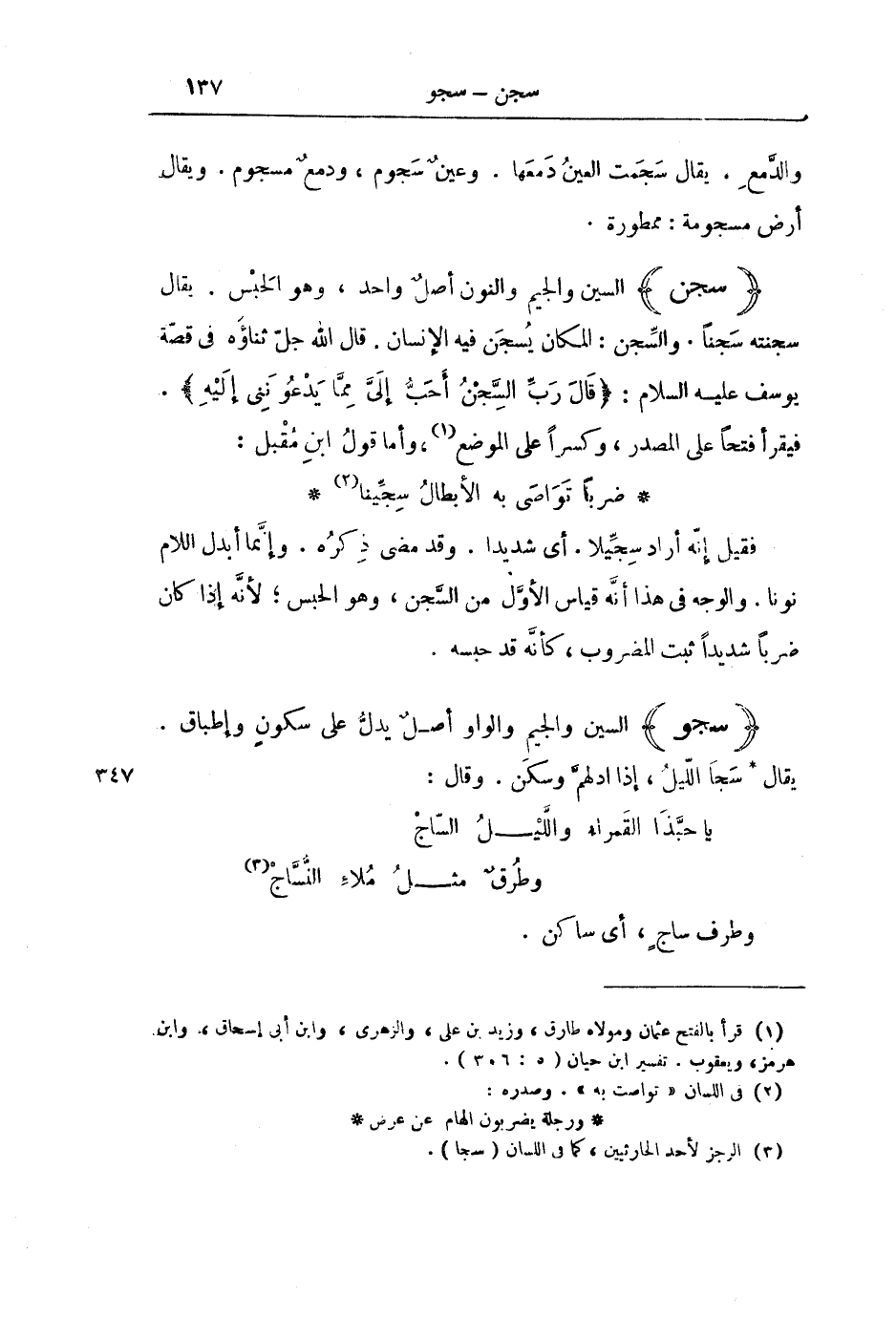 (سَجَنَ) السِّينُ وَالْجِيمُ وَالنُّونُ أَصْلٌ وَاحِدٌ، وَهُوَ الْحَبْسُ. يُقَالُ سَجَنْتُهُ سَجْنًا. وَالسِّجْنُ: الْمَكَانُ يُسْجَنُ فِيهِ الْإِنْسَانُ. قَالَ اللَّهُ جَلَّ ثَنَاؤُهُ فِي قِصَّةِ يُوسُفَ عَلَيْهِ السَّلَامُ: {قَالَ رَبِّ السِّجْنُ أَحَبُّ إِلَيَّ مِمَّا يَدْعُونَنِي إِلَيْهِ} [يوسف: 33] . فَيُقْرَأُ فَتْحًا عَلَى الْمَصْدَرِ، وَكَسْرًا عَلَى الْمَوْضِعِ، وَأَمَّا قَوْلُ ابْنِ مُقْبِلٍ: