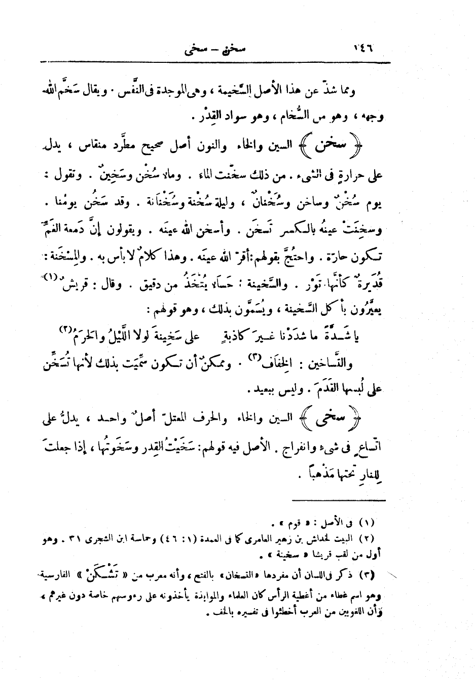 (سَخُنَ) السِّينُ وَالْخَاءُ وَالنُّونُ أَصْلٌ صَحِيحٌ مُطَّرِدٌ مُنْقَاسٌ، يَدُلُّ عَلَى حَرَارَةٍ فِي الشَّيْءِ. مِنْ ذَلِكَ سَخَّنْتُ الْمَاءَ. وَمَاءٌ سُخْنٌ وَسَخِينٌ. وَتَقُولُ: يَوْمٌ سُخْنٌ وَسَاخِنٌ وَسَُخْنَانٌ، وَلَيْلَةٌ سُخْنَةٌ وَسَُخْنَانَةٌ. وَقَدْ سَخُنَ يَوْمُنَا. وَسَخِنَتْ عَيْنُهُ بِالْكَسْرِ تَسْخَنُ. وَأَسْخَنَ اللَّهُ عَيْنَهُ. وَيَقُولُونَ إِنَّ دَمْعَةَ الْغَمِّ تَكُونُ حَارَّةً. وَاحْتُجَّ بِقَوْلِهِمْ: أَقَرَّ اللَّهُ عَيْنَهُ. وَهَذَا كَلَامٌ لَا بَأْسَ بِهِ. وَالْمِسْخَنَةُ: قُدَيْرَةٌ كَأَنَّهَا تَوْرٌ. وَالسَّخِينَةُ: حَسَاءٌ يُتَّخَذُ مِنْ دَقِيقٍ. وَقَالَ: قُرَيْشٌ يُعَيَّرُونَ بِأَكْلِ السَّخِينَةِ، وَيُسَمَّوْنَ بِذَلِكَ، وَهُوَ قَوْلُهُمْ: