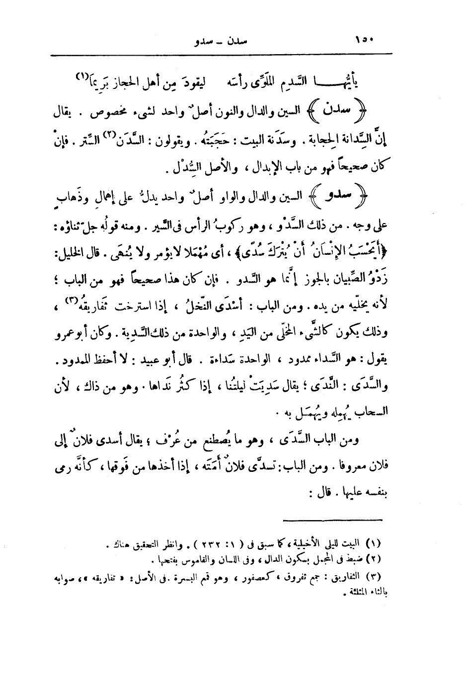 (سَدَوَ) السِّينُ وَالدَّالُ وَالْوَاوُ أَصْلٌ وَاحِدٌ يَدُلُّ عَلَى إِهْمَالٍ وَذَهَابٍ عَلَى وَجْهٍ. مِنْ ذَلِكَ السَّدْوُ، وَهُوَ رُكُوبُ الرَّأْسِ فِي السَّيْرِ. وَمِنْهُ قَوْلُهُ جَلَّ ثَنَاؤُهُ: {أَيَحْسَبُ الْإِنْسَانُ أَنْ يُتْرَكَ سُدًى} [القيامة: 36] ، أَيْ مُهْمَلًا لَا يُؤْمَرُ وَلَا يُنْهَى. قَالَ الْخَلِيلُ: زَدْوُ الصِّبْيَانِ بِالْجَوْزِ إِنَّمَا هُوَ السَّدْوُ. فَإِنْ كَانَ هَذَا صَحِيحًا فَهُوَ مِنَ الْبَابِ ; لِأَنَّهُ يُخَلِّيهِ مِنْ يَدِهِ. وَمِنَ الْبَابِ: أَسْدَى النَّخْلُ، إِذَا اسْتَرْخَتْ ثَفَارِيقُهُ، وَذَلِكَ يَكُونُ كَالشَّيْءِ الْمُخَلَّى مِنَ الْيَدِ، وَالْوَاحِدَةُ مِنْ ذَلِكَ السَّدِيَّةُ. وَكَانَ أَبُو عَمْرٍو يَقُولُ: هُوَ السَّدَاءُ مَمْدُودٌ، الْوَاحِدَةُ سَدَاءَةُ. قَالَ أَبُو عُبَيْدٍ: لَا أَحْفَظُ الْمَمْدُودَ. وَالسَّدَى: النَّدَى ; يُقَالُ سَدِيَتْ لَيْلَتُنَا، إِذَا كَثُرَ نَدَاهَا. وَهُوَ مِنْ ذَاكَ، لِأَنَّ السَّحَابَ يُهْمِلُهُ وَيُهْمَلُ بِهِ.