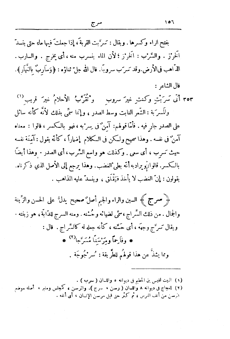 (سَرَجَ) السِّينُ وَالرَّاءُ وَالْجِيمُ أَصْلٌ صَحِيحٌ يَدُلُّ عَلَى الْحُسْنِ وَالزِّينَةِ وَالْجَمَالِ. مِنْ ذَلِكَ السِّرَاجِ، سُمِّيَ لِضِيَائِهِ وَحُسْنِهِ. وَمِنْهُ السَّرْجُ لِلدَّابَّةِ. هُوَ زِينَتُهُ. وَيُقَالُ سَرَّجَ وَجْهَهُ، أَيْ حَسَّنَهُ، كَأَنَّهُ جَعَلَهُ لَهُ كَالسِّرَاجِ. قَالَ:
