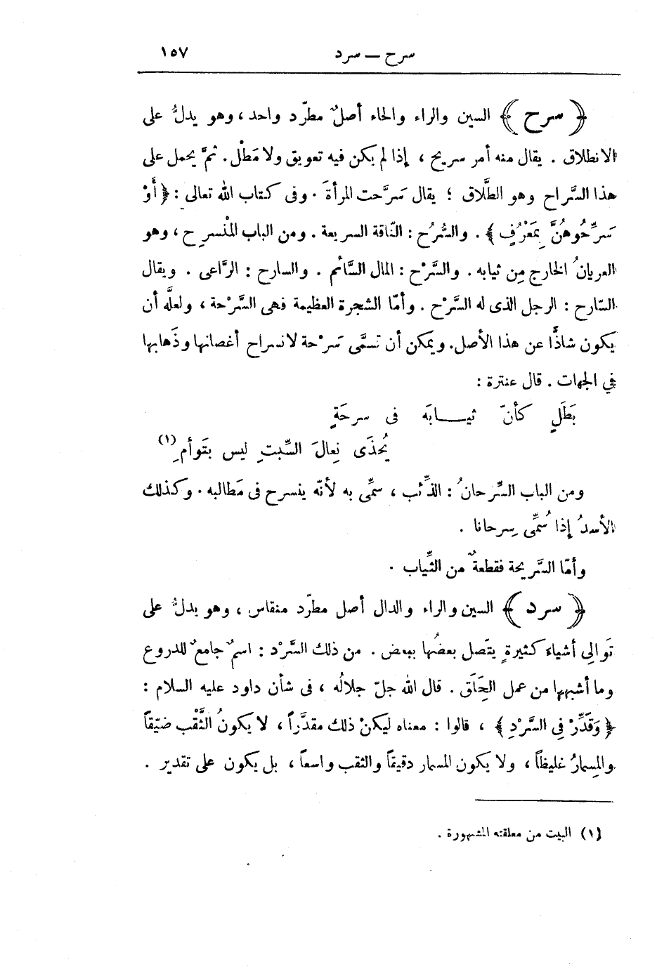 (سَرَحَ) السِّينُ وَالرَّاءُ وَالْحَاءُ أَصْلٌ مُطَّرِدٌ وَاحِدٌ، وَهُوَ يَدُلُّ عَلَى الِانْطِلَاقِ. يُقَالُ مِنْهُ أَمْرٌ سَرِيحٌ، إِذَا لَمْ يَكُنْ فِيهِ تَعْوِيقٌ وَلَا مَطْلٌ. ثُمَّ يُحْمَلُ عَلَى هَذَا السَّرَاحِ وَهُوَ الطَّلَاقُ ; يُقَالُ سَرَّحْتُ الْمَرْأَةَ. وَفِي كِتَابِ اللَّهِ تَعَالَى: {أَوْ سَرِّحُوهُنَّ بِمَعْرُوفٍ} [البقرة: 231] . وَالسُّرُحُ: النَّاقَةُ السَّرِيعَةُ. وَمِنَ الْبَابِ الْمُنْسَرِحُ، وَهُوَ الْعُرْيَانُ الْخَارِجُ مِنْ ثِيَابِهِ. وَالسَّرْحُ: الْمَالُ السَّائِمُ. وَالسَّارِحُ: الرَّاعِي. وَيُقَالُ السَّارِحُ: الرَّجُلُ الَّذِي لَهُ السَّرْحُ. وَأَمَّا الشَّجَرَةُ الْعَظِيمَةُ فَهِيَ السَّرْحَةُ، وَلَعَلَّهُ أَنَّ يَكُونَ شَاذًّا عَنْ هَذَا الْأَصْلِ. وَيُمْكِنُ أَنْ تُسَمَّى سَرْحَةً لِانْسِرَاحِ أَغْصَانِهَا وَذَهَابِهَا فِي الْجِهَاتِ. قَالَ عَنْتَرَةُ: