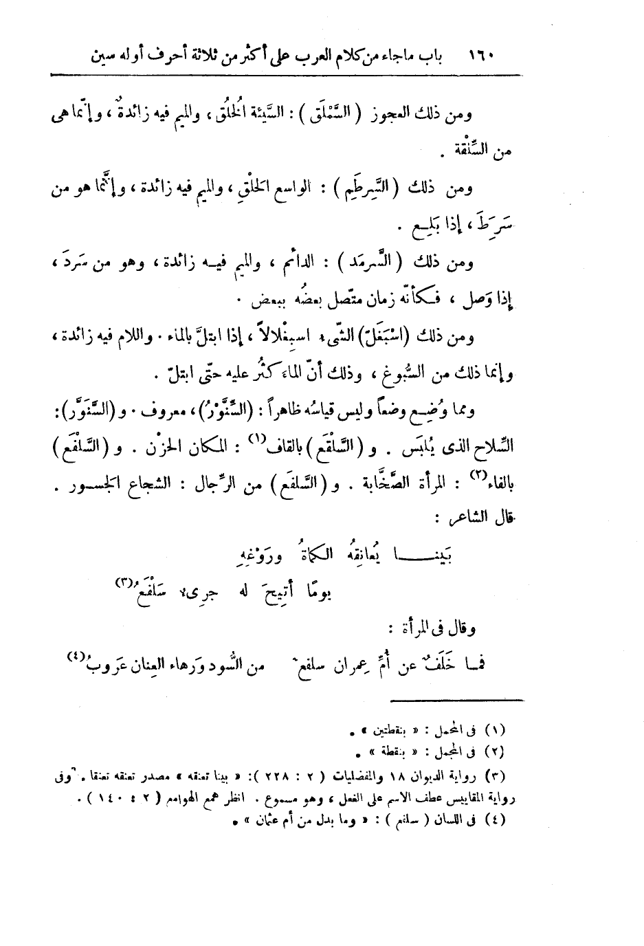 وَمِمَّا وُضِعَ وَضْعًا وَلَيْسَ قِيَاسُهُ ظَاهِرًا: (السِّنَّوْرُ) ، مَعْرُوفٌ. وَ (السَّنَوَّرُ) : السِّلَاحُ الَّذِي يُلْبَسُ. وَ (السَّلْقَعُ) بِالْقَافِ: الْمَكَانُ الْحَزْنُ. وَ (السَّلْفَعُ) بِالْفَاءِ: الْمَرْأَةُ الصَّخَّابَةُ. وَ (السَّلْفَعُ) مِنَ الرِّجَالِ: الشُّجَاعُ الْجَسُورُ. قَالَ الشَّاعِرُ: