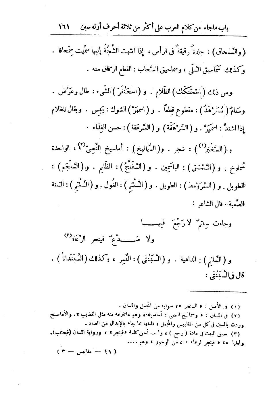 وَمِنْ ذَلِكَ (اسْحَنْكَكَ) الظَّلَامُ. وَ (اسْحَنْفَرَ) الشَّيْءُ: طَالَ وَعَرُضَ. وَسَنَامٌ (مُسَرْهَدٌ) : مَقْطُوعٌ قِطَعًا. وَ (اسْمَهَرَّ) الشَّوْكُ: يَبِسَ. وَيُقَالُ لِلظَّلَامِ إِذَا اشْتَدَّ: اسْمَهَرَّ. وَ (السَّرْهَفَةُ) . وَ (السَّرْعَفَةُ) : حَسَنُ الْغِذَاءِ.