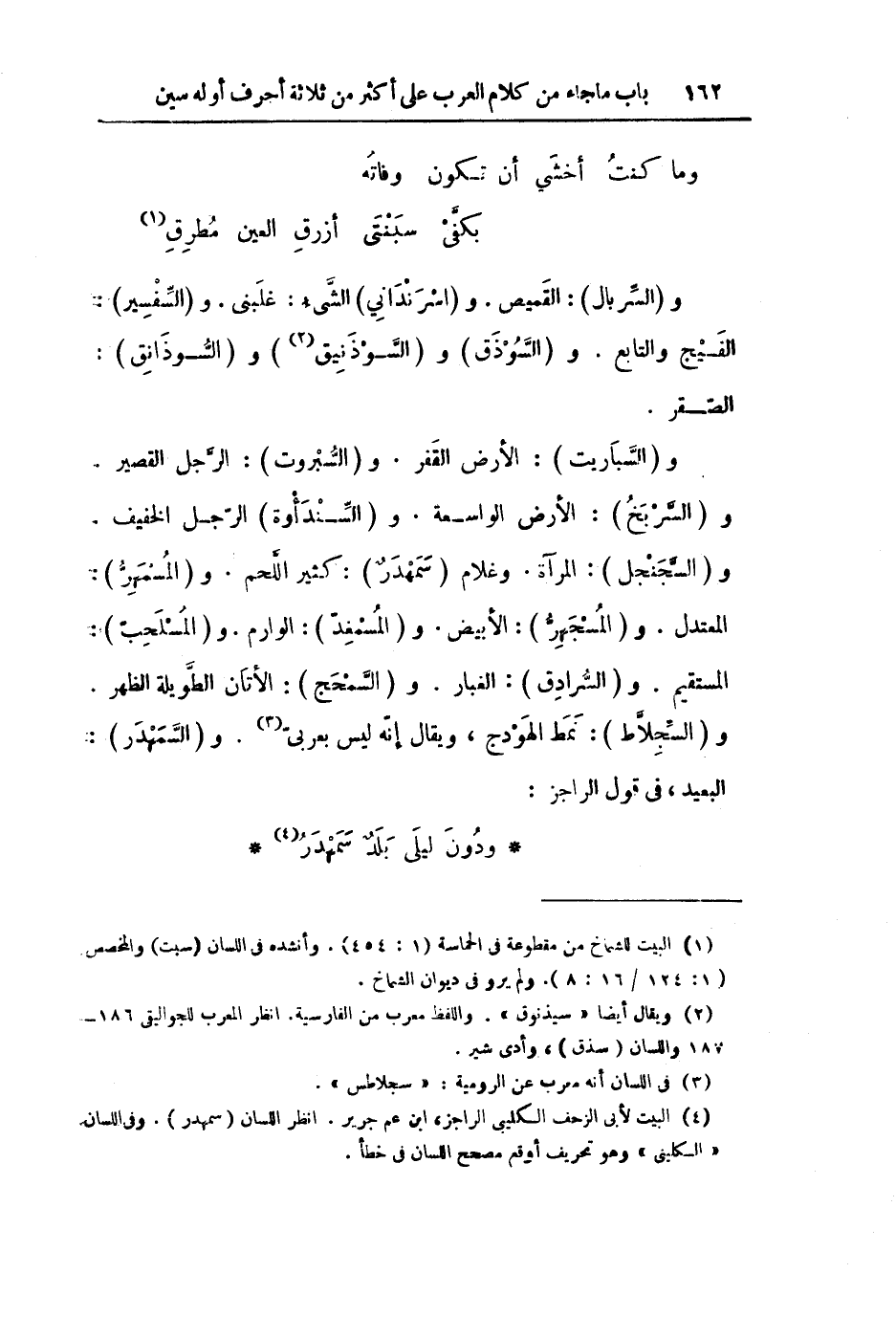 وَ (السَّبَارِيتُ) : الْأَرْضُ الْقَفْرُ. وَ (السُّبْرُوتُ) : الرَّجُلُ الْقَصِيرُ. وَ (السَّرْبَخُ) : الْأَرْضُ الْوَاسِعَةُ. (السِّنْدَأْوَةُ) : الرَّجُلُ الْخَفِيفُ. وَ (السَّجَنْجَلُ) : الْمِرْآةُ. وَغُلَامٌ (سَمَهْدَرٌ) : كَثِيرُ اللَّحْمِ. وَ (الْمُسْمَهِرُّ) : الْمُعْتَدِلُ. وَ (الْمُسْجَهِرُّ) : الْأَبْيَضُ. وَ (الْمُسْمَغِدُّ) : الْوَارِمُ. وَ (الْمُسْلَحِبُّ) : الْمُسْتَقِيمُ. وَ (السُّرَادِقُ) : الْغُبَارُ. وَ (السَّمْحَجُ) : الْأَتَانُ الطَّوِيلَةُ الظَّهْرِ. وَ (السِّجِلَّاطُ) : نَمَطُ الْهَوْدَجِ، وَيُقَالُ إِنَّهُ لَيْسَ بِعَرَبِيٍّ. وَ (السَّمَهْدَرُ) : الْبَعِيدُ، فِي قَوْلِ الرَّاجِزِ: