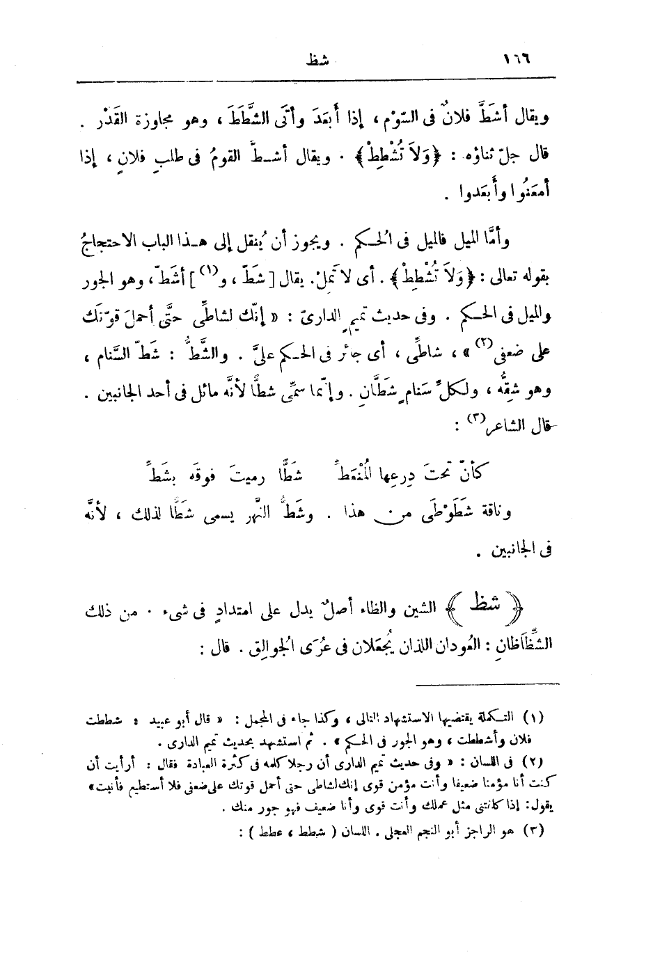 وَأَمَّا الْمَيْلُ فَالْمَيْلُ فِي الْحُكْمِ. وَيَجُوزُ أَنَّ يُنْقَلَ إِلَى هَذَا الْبَابِ الِاحْتِجَاجُ بِقَوْلِهِ تَعَالَى: {وَلَا تُشْطِطْ} [ص: 22] . أَيْ لَا تَمِلْ. يُقَالُ [شَطَّ، وَ] أَشَطَّ، وَهُوَ الْجَوْرُ وَالْمَيْلُ فِي الْحُكْمِ. وَفِي حَدِيثِ تَمِيمٍ الدَّارِيِّ: «إِنَّكَ لَشَاطِّيٌّ حَتَّى أَحْمِلَ قُوَّتَكَ عَلَى ضَعْفِي» ، شَاطِّيٌّ، أَيْ جَائِرٌ فِي الْحُكْمِ عَلَيَّ. وَالشَّطُّ: شَطُّ السَّنَامِ، وَهُوَ شِقُّهُ، وَلِكُلِّ سَنَامٍ شَطَّانِ. وَإِنَّمَا سُمِّيَ شَطًّا لِأَنَّهُ مَائِلٌ فِي أَحَدِ الْجَانِبَيْنِ. قَالَ الشَّاعِرُ: