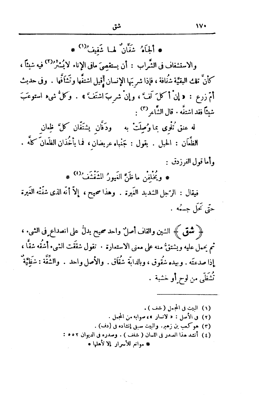وَالِاسْتِشْفَافُ فِي الشَّرَابِ: أَنْ يَسْتَقْصِيَ مَا فِي الْإِنَاءِ لَا يُسْئِرُ فِيهِ شَيْئًا، كَأَنَّ تِلْكَ الْبَقِيَّةَ شُفَافَةٌ، فَإِذَا شَرِبَهَا الْإِنْسَانُ قِيلَ اشْتَفَّهَا وَتَشَافَّهَا. وَفِي حَدِيثِ أُمِّ زَرْعٍ: «إِنْ أَكَلَ لَفَّ، وَإِنْ شَرِبَ اشْتَفَّ» . وَكُلُّ شَيْءٍ اسْتَوْعَبَ شَيْئًا فَقَدِ اشْتَفَّهُ. قَالَ الشَّاعِرُ: