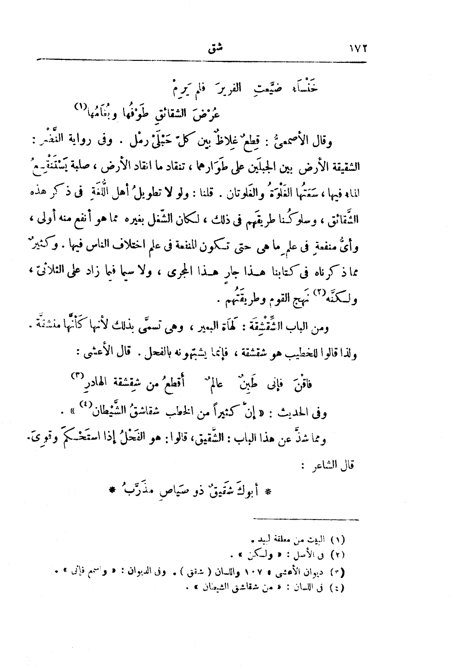 وَقَالَ الْأَصْمَعِيُّ: قِطَعٌ غِلَاظٌ بَيْنَ كُلِّ حَبْلَيْ رَمْلٍ. وَفِي رِوَايَةِ النَّضْرِ: الشَّقِيقَةُ الْأَرْضُ بَيْنَ الْجَبَلَيْنِ عَلَى طَوَارِهِمَا، تَنْقَادُ مَا انْقَادَ الْأَرْضُ، صَلْبَةٌ يَسْتَنْقِعُ الْمَاءُ فِيهَا، سَعَتُهَا الْغَلْوَةُ وَالْغَلْوَتَانِ. قُلْنَا: وَلَوْلَا تَطْوِيلُ أَهْلِ اللُّغَةِ فِي ذِكْرِ هَذِهِ الشَّقَائِقِ، وَسُلُوكُنَا طَرِيقَهُمْ فِي ذَلِكَ، لَكَانَ الشَّغْلُ بِغَيْرِهِ مِمَّا هُوَ أَنْفَعُ مِنْهُ أَوْلَى، وَأَيُّ مَنْفَعَةٍ فِي عِلْمٍ مَا هِيَ حَتَّى تَكُونَ الْمَنْفَعَةُ فِي عِلْمِ اخْتِلَافِ النَّاسِ فِيهَا. وَكَثِيرٌ مِمَّا ذَكَرْنَاهُ فِي كِتَابِنَا هَذَا جَارٍ هَذَا الْمَجْرَى، وَلَا سِيَّمَا فِيمَا زَادَ عَلَى الثُّلَاثِيِّ، وَلَكِنَّهُ نَهْجُ الْقَوْمِ وَطَرِيقَتُهُمْ.
