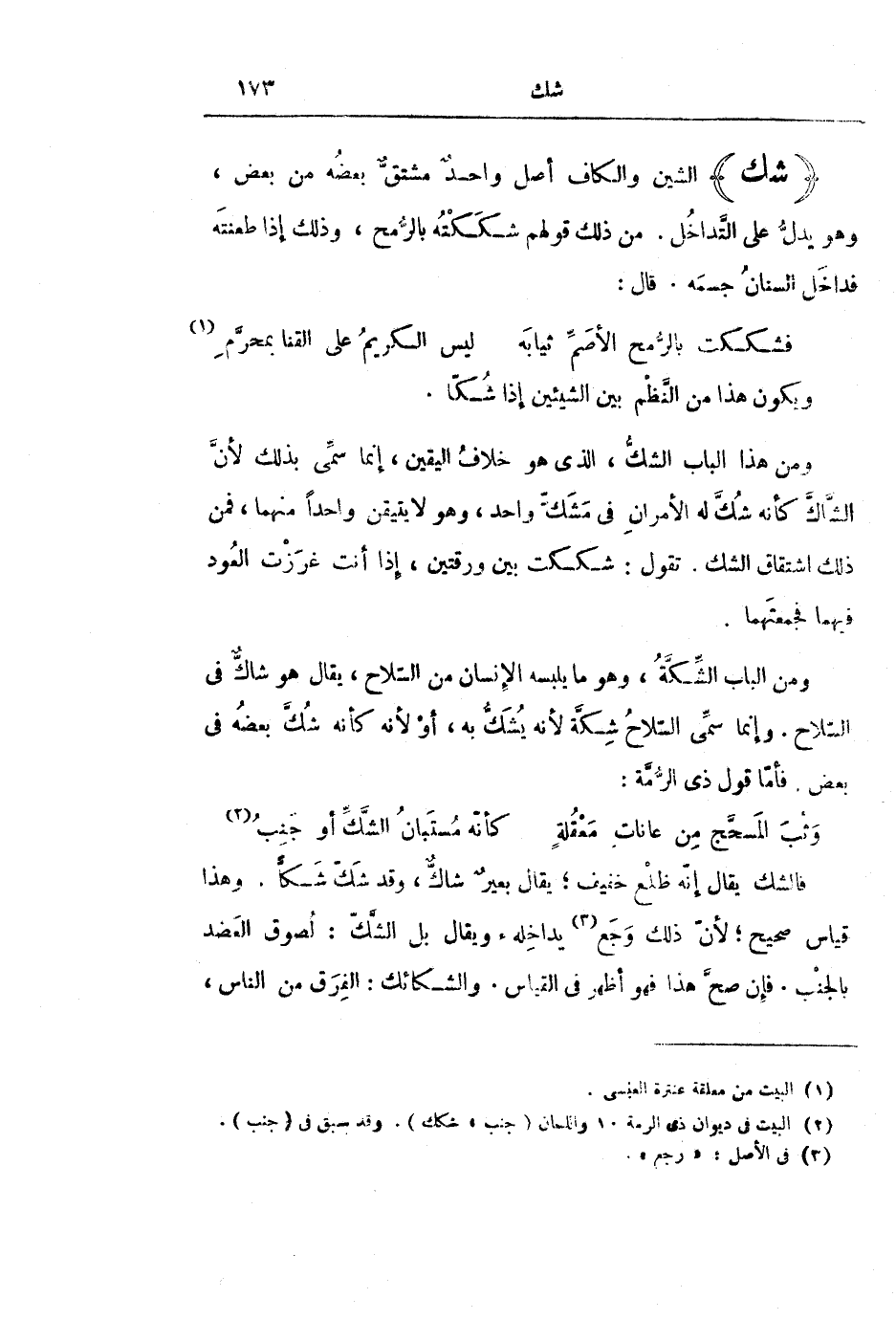 وَمِنْ هَذَا الْبَابِ الشَّكُّ، الَّذِي هُوَ خِلَافُ الْيَقِينِ، إِنَّمَا سُمِّيَ بِذَلِكَ لِأَنَّ الشَّاكَّ كَأَنَّهُ شُكَّ لَهُ الْأَمْرَانِ فِي مَشَكٍّ وَاحِدٍ، وَهُوَ لَا يَتَيَقَّنُ وَاحِدًا مِنْهُمَا، فَمِنْ ذَلِكَ اشْتِقَاقُ الشَّكِّ. تَقُولُ: شَكَكْتُ بَيْنَ وَرَقَتَيْنِ، إِذَا أَنْتَ غَرَزْتَ الْعُودَ فِيهِمَا فَجَمَعْتَهُمَا.