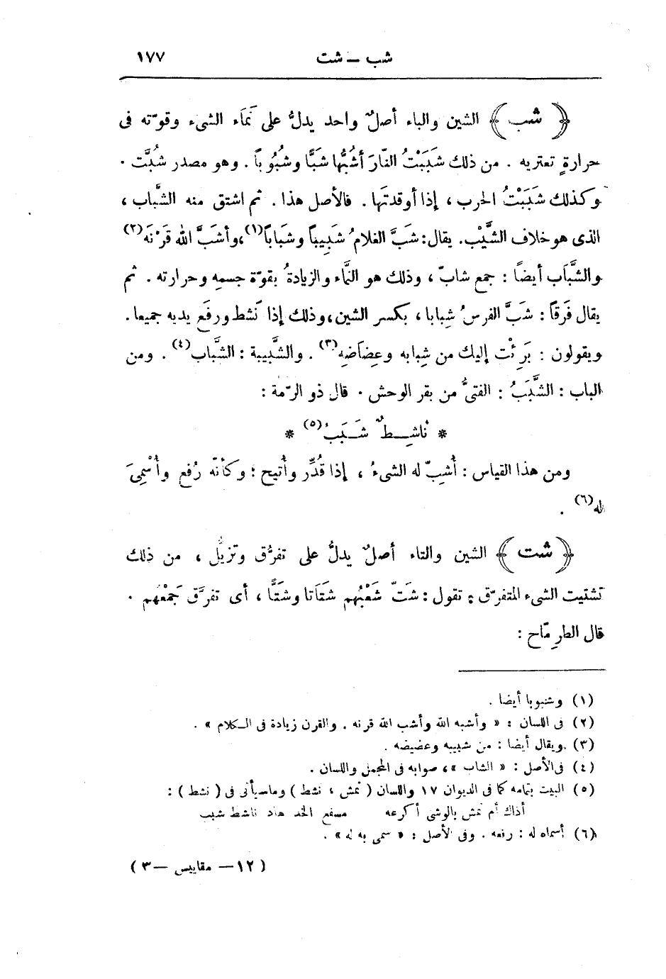 (شَبَّ) الشِّينُ وَالْبَاءُ أَصْلٌ وَاحِدٌ يَدُلُّ عَلَى نَمَاءِ الشَّيْءِ، وَقُوَّتِهِ فِي حَرَارَةٍ تَعْتَرِيهِ. مِنْ ذَلِكَ شَبَبْتُ النَّارَ أَشُبُّهَا شَبًّا وَشُبُوبًا. وَهُوَ مَصْدَرُ شُبَّتْ. وَكَذَلِكَ شَبَبْتُ الْحَرْبَ، إِذَا أَوْقَدْتَهَا. فَالْأَصْلُ هَذَا. ثُمَّ اشْتُقَّ مِنْهُ الشَّبَابُ، الَّذِي هُوَ خِلَافُ الشَّيْبِ. يُقَالُ: شَبَّ الْغُلَامُ شَبِيبًا وَشَبَابًا، وَأَشَبَّ اللَّهُ قَرْنَهُ وَالشَّبَابُ أَيْضًا: جَمْعُ شَابٍّ، وَذَلِكَ هُوَ النَّمَاءُ وَالزِّيَادَةُ بِقُوَّةِ جِسْمِهِ وَحَرَارَتِهِ. ثُمَّ يُقَالُ فَرْقًا: شَبَّ الْفَرَسُ شِبَابًا، بِكَسْرِ الشِّينِ، وَذَلِكَ إِذَا نَشِطَ وَرَفَعَ يَدَيْهِ جَمِيعًا. وَيَقُولُونَ: بَرِئْتُ إِلَيْكَ مِنْ شِبَابِهِ وَعِضَاضِهِ. وَالشَّبِيبَةُ: الشَّبَابُ. وَمِنَ الْبَابِ: الشَّبَبُ: الْفَتِيُّ مِنْ بَقَرِ الْوَحْشِ. قَالَ ذُو الرُّمَّةِ: