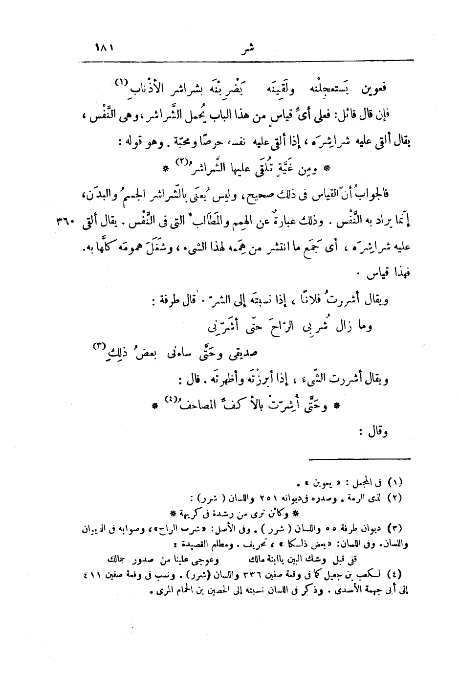 وَيُقَالُ أَشْرَرْتُ فُلَانًا، إِذَا نَسَبْتَهُ إِلَى الشَّرِّ. قَالَ طَرَفَةُ: