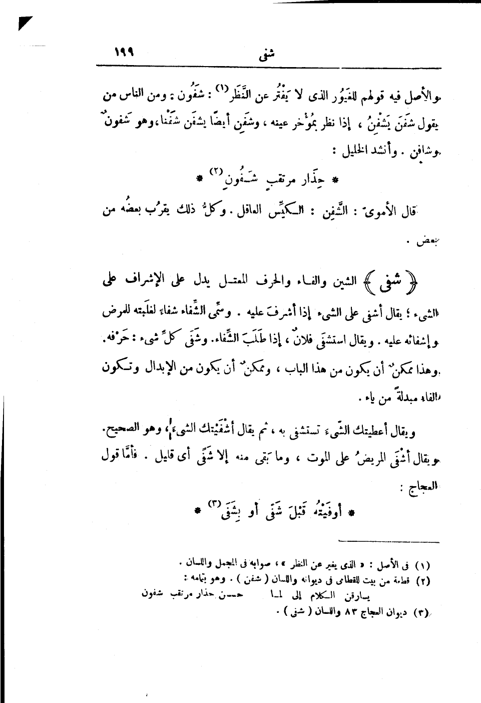 وَيُقَالُ أَعْطَيْتُكَ الشَّيْءَ تَسْتَشِفِي بِهِ، ثُمَّ يُقَالُ أَشْفَيْتُكَ الشَّيْءَ، وَهُوَ الصَّحِيحُ. وَيُقَالُ أَشْفَى الْمَرِيضُ عَلَى الْمَوْتِ، وَمَا بَقِيَ مِنْهُ إِلَّا شَفًى أَيْ قَلِيلٌ. فَأَمَّا قَوْلُ الْعَجَّاجِ: