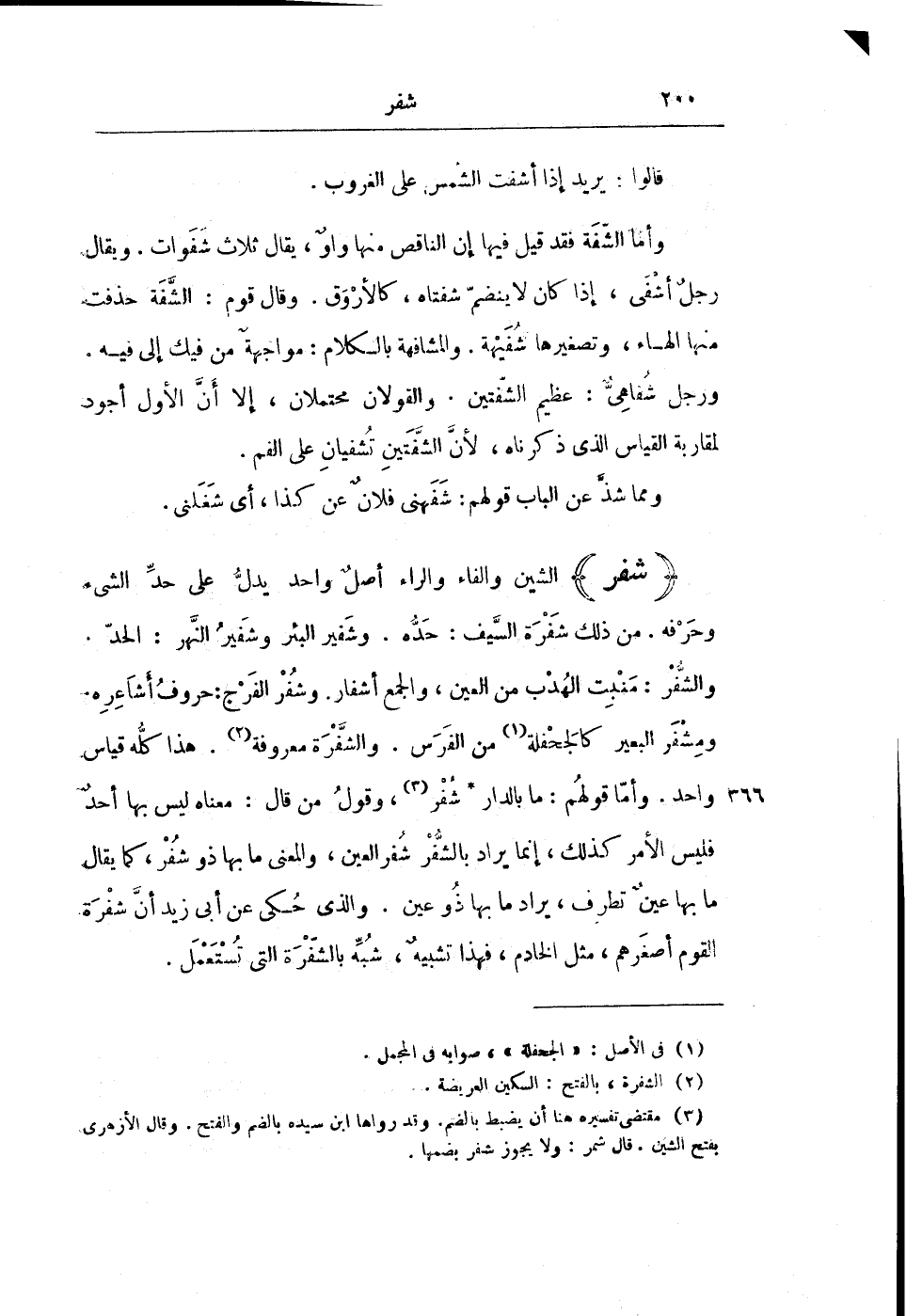 وَالشُّفْرُ: مَنْبِتُ الْهُدْبِ مِنَ الْعَيْنِ، وَالْجَمْعُ أَشْفَارٌ. وَشُفْرُ الْفَرْجِ: حُرُوفُ أَشَاعِرِهِ. وَمِشْفَرُ الْبَعِيرِ كَالْجَحْفَلَةِ مِنَ الْفَرَسِ. وَالشَّفْرَةُ مَعْرُوفَةٌ. هَذَا كُلُّهُ قِيَاسٌ وَاحِدٌ. وَأَمَّا قَوْلُهُمْ: مَا بِالدَّارِ شُفْرٌ، وَقَوْلُ مَنْ قَالَ: مَعْنَاهُ لَيْسَ بِهَا أَحَدٌ فَلَيْسَ الْأَمْرُ كَذَلِكَ، إِنَّمَا يُرَادُ بِالشُّفْرِ شُفْرَ الْعَيْنِ، وَالْمَعْنَى مَا بِهَا ذُو شُفْرٍ، كَمَا يُقَالُ مَا بِهَا عَيْنٌ تَطْرُفُ، يُرَادُ مَا بِهَا ذُو عَيْنٍ. وَالَّذِي حُكِيَ عَنْ أَبِي زَيْدٍ أَنَّ شَفْرَةَ الْقَوْمِ أَصْغَرُهُمْ، مِثْلُ الْخَادِمِ، فَهَذَا تَشْبِيهٌ، شُبِّهَ بِالشَّفْرَةِ الَّتِي تُسْتَعْمَلُ.