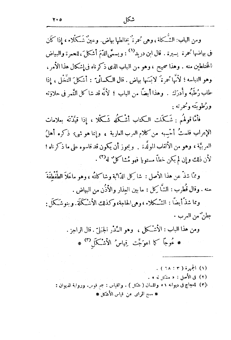 وَمِمَّا شَذَّ أَيْضًا: الشَّكْلَاءُ، وَهِيَ الْحَاجَةُ، وَكَذَلِكَ الْأَشْكَلَةُ. وَبَنُو شَكَلٍ: بَطْنٌ مِنَ الْعَرَبِ.