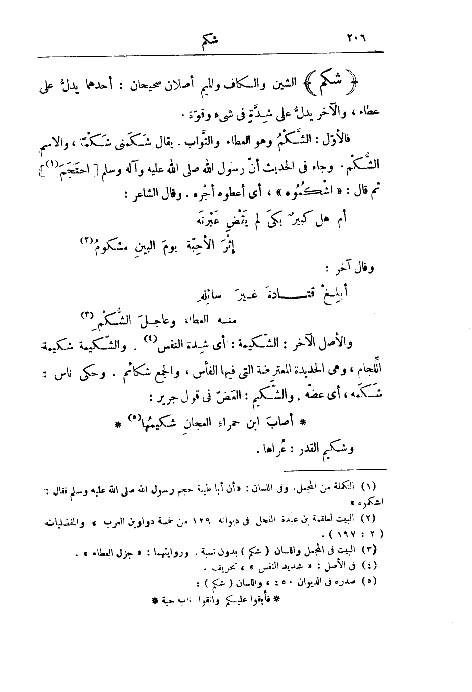 فَالْأَوَّلُ: الشَّكْمُ وَهُوَ الْعَطَاءُ وَالثَّوَابُ. يُقَالُ شَكَمَنِي شَكْمًا، وَالِاسْمُ الشُّكْمُ. وَجَاءَ فِي الْحَدِيثِ أَنَّ رَسُولَ اللَّهِ صَلَّى اللَّهُ عَلَيْهِ وَآلِهِ وَسَلَّمَ [ «احْتَجَمَ ثُمَّ قَالَ: اشْكُمُوهُ» ] ، أَيْ أَعْطَوهُ أَجْرَهُ. وَقَالَ الشَّاعِرُ: