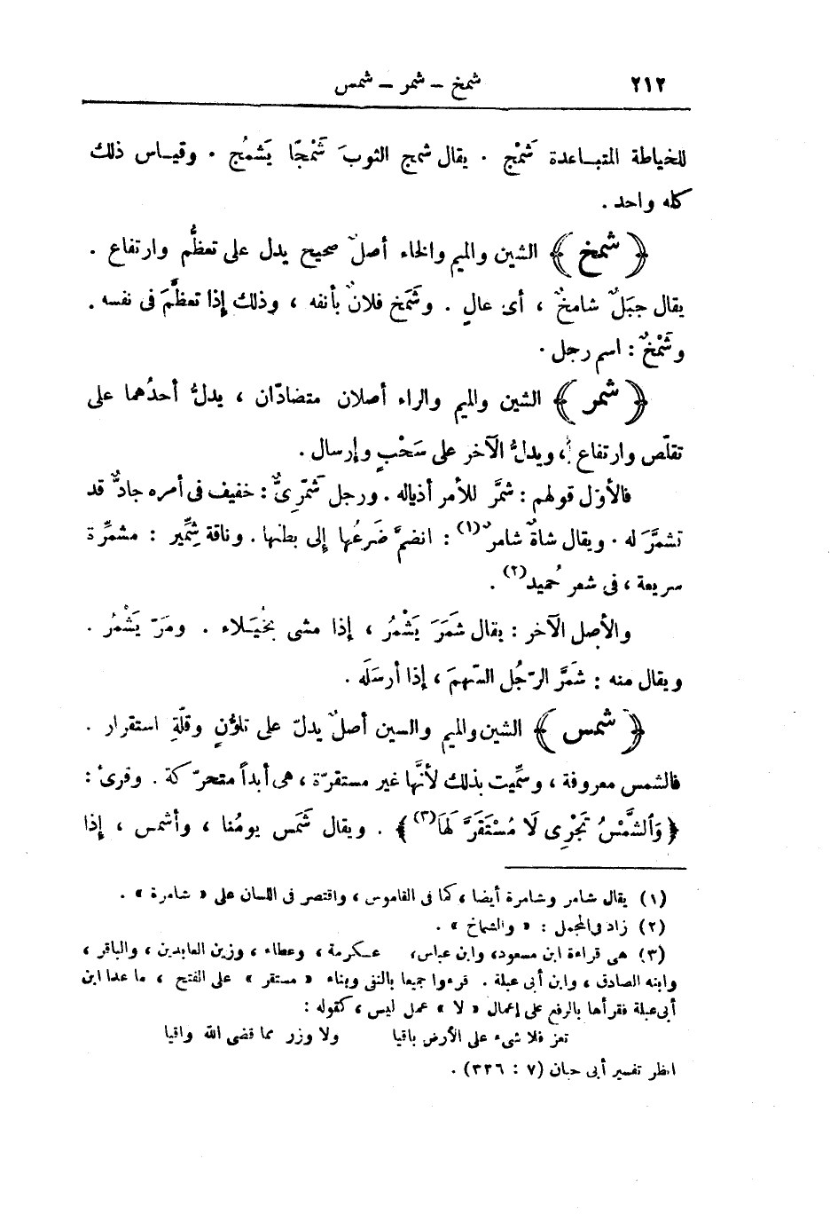 (شَمَرَ) الشِّينُ وَالْمِيمُ وَالرَّاءُ أَصْلَانِ مُتَضَادَّانِ، يَدُلُّ أَحَدُهُمَا عَلَى تَقَلُّصٍ وَارْتِفَاعٍ، وَيَدُلُّ الْآخَرُ عَلَى سَحْبٍ وَإِرْسَالٍ.