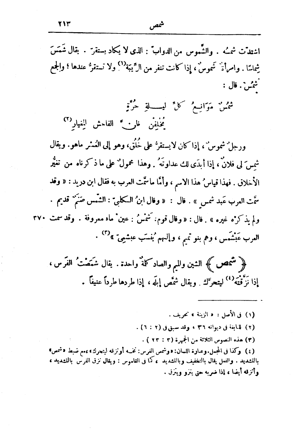 وَرَجُلٌ شُمُوسٌ، إِذَا كَانَ لَا يَسْتَقِرُّ عَلَى خُلُقٍ، وَهُوَ إِلَى الْعُسْرِ مَا هُوَ. وَيُقَالُ شَمِسَ لِي فُلَانٌ، إِذَا أَبْدَى لَكَ عَدَاوَتَهُ. وَهَذَا مَحْمُولٌ عَلَى مَا ذَكَرْنَاهُ مِنْ تَغَيُّرِ الْأَخْلَاقِ. فَهَذَا قِيَاسُ هَذَا الِاسْمِ، وَأَمَّا مَا سَمَّتِ الْعَرَبُ بِهِ فَقَالَ ابْنُ دُرَيْدٍ: " وَقَدْ سَمَّتِ الْعَرَبُ عَبْدَ شَمْسٍ ". قَالَ: " وَقَالَ ابْنُ الْكَلْبِيِّ: الشَّمْسُ صَنَمٌ قَدِيمٌ. وَلَمْ يَذْكُرْهُ غَيْرُهُ ". قَالَ: " وَقَالَ قَوْمٌ: شَمْسُ: عَيْنُ مَاءٍ مَعْرُوفَةٌ. وَقَدْ سَمَّتِ الْعَرَبُ عَبْشَمْسَ، وَهُمْ بَنُو تَمِيمٍ، وَإِلَيْهِمْ يُنْسَبُ عَبْشَمِيٌّ ".