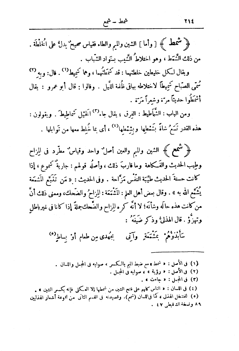 (شَمَعَ) الشِّينُ وَالْمِيمُ وَالْعَيْنُ أَصْلٌ وَاحِدٌ وَقِيَاسٌ مُطَّرِدٌ فِي الْمِزَاحِ وَطِيبِ الْحَدِيثِ وَالْفَكَاهَةِ وَمَا قَارَبَ ذَلِكَ، وَأَصْلُهُ قَوْلُهُمْ: جَارِيَةٌ شَمُوعٌ، إِذَا كَانَتْ حَسَنَةَ الْحَدِيثِ طَيِّبَةَ النَّفْسِ مَزَّاحَةً. وَفِي الْحَدِيثِ: «مَنْ تَتَبَّعَ الْمَشْمَعَةَ يُشَمِّعِ اللَّهُ بِهِ» . وَقَالَ بَعْضُ أَهْلِ الْعِلْمِ: الْمَشْمَعَةُ: الْمِزَاحُ وَالضَّحِكُ، وَمَعْنَى ذَلِكَ أَنَّ مَنْ كَانَتْ هَذِهِ حَالَهُ وَشَأْنَهُ ; لَا أَنَّهُ كَرِهَ الْمِزَاحَ وَالضَّحِكَ جُمْلَةً إِذَا كَانَا فِي غَيْرِ بَاطِلٍ وَتَهَزُّؤٍ. قَالَ الْهُذَلِيُّ وَذَكَرَ ضَيْفَهُ: