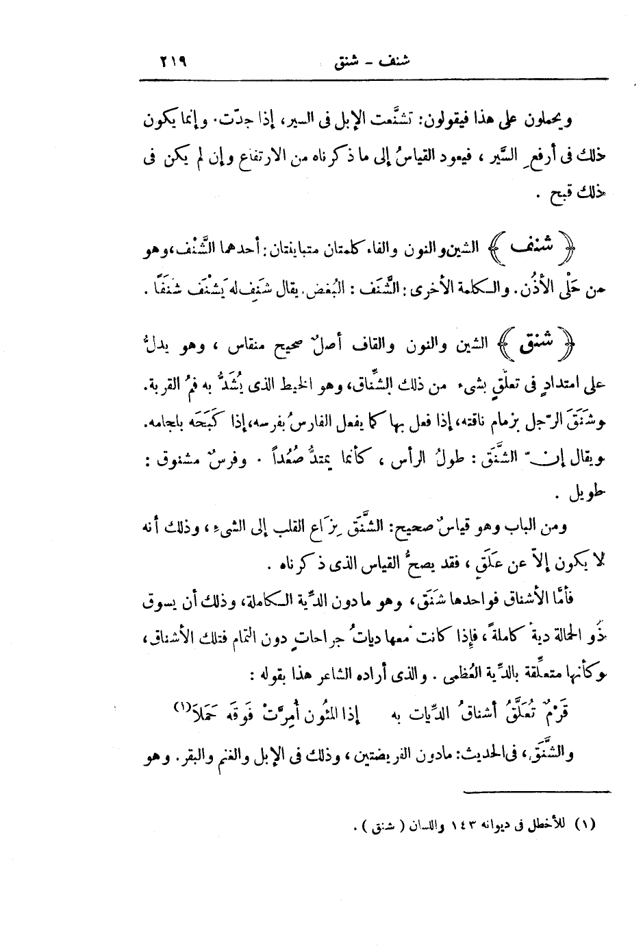 فَأَمَّا الْأَشْنَاقُ فَوَاحِدُهَا شَنَقٌ، وَهُوَ مَا دُونَ الدِّيَةِ الْكَامِلَةِ، وَذَلِكَ أَنْ يَسُوقَ ذُو الْحَمَالَةِ دِيَةً كَامِلَةً، فَإِذَا كَانَتْ مَعَهَا دِيَاتُ جَرَاحَاتٍ دُونَ التَّمَامِ فَتِلْكَ الْأَشْنَاقُ، وَكَأَنَّهَا مُتَعَلِّقَةٌ بِالدِّيَةِ الْعُظْمَى. وَالَّذِي أَرَادَهُ الشَّاعِرُ هَذَا بِقَوْلِهِ: