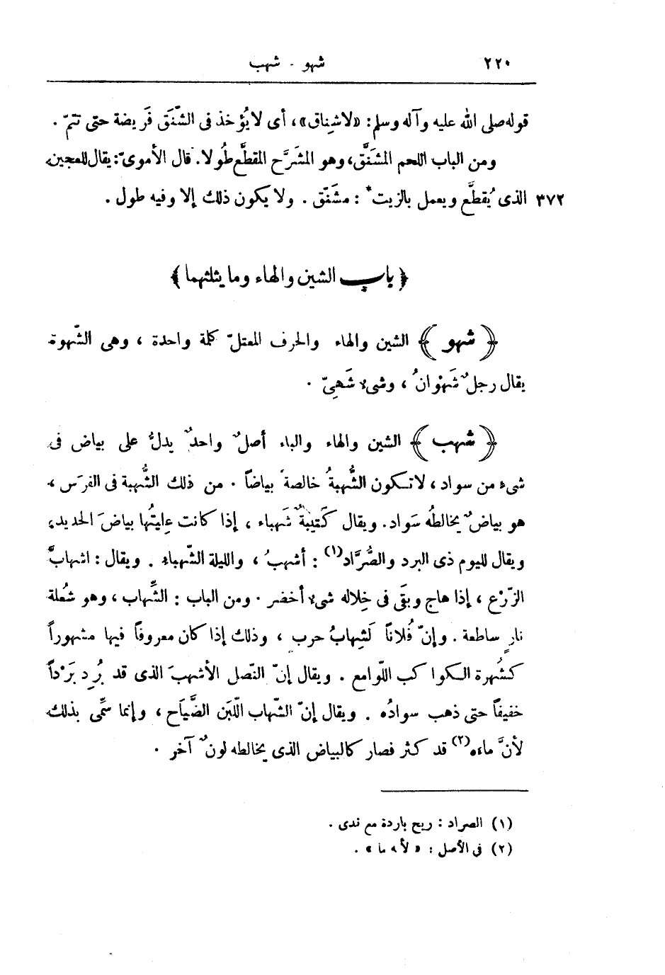 (شَهَِبَ) الشِّينُ وَالْهَاءُ وَالْبَاءُ أَصْلٌ وَاحِدٌ يَدُلُّ عَلَى بَيَاضٍ فِي شَيْءٍ مِنْ سَوَادٍ، لَا تَكُونُ الشُّهْبَةُ خَالِصَةً بَيَاضًا. وَمِنْ ذَلِكَ الشُّهْبَةُ فِي الْفَرَسِ، هُوَ بَيَاضٌ يُخَالِطُهُ سَوَادٌ. وَيُقَالُ كَتِيبَةٌ شَهْبَاءُ، إِذَا كَانَتْ عِلْيَتُهَا بَيَاضَ الْحَدِيدِ، وَيُقَالُ لِلْيَوْمِ ذِي الْبَرْدِ وَالصُّرَّادِ: أَشْهَبُ، وَاللَّيْلَةُ الشَّهْبَاءُ. وَيُقَالُ: اشْهَابَّ الزَّرْعُ، إِذَا هَاجَ وَبَقِيَ فِي خِلَالِهِ شَيْءٌ أَخْضَرُ. وَمِنَ الْبَابِ: الشِّهَابُ، وَهُوَ شُعْلَةُ نَارٍ سَاطِعَةٌ. وَإِنَّ فُلَانًا لَشِهَابُ حَرْبٍ، وَذَلِكَ إِذَا كَانَ مَعْرُوفًا فِيهَا مَشْهُورًا كَشُهْرَةِ الْكَوَاكِبِ اللَّوَامِعِ. وَيُقَالُ إِنَّ النَّصْلَ الْأَشْهَبَ الَّذِي قَدْ بُرِدَ بَرْدًا خَفِيفًا حَتَّى ذَهَبَ سَوَادُهُ. وَيُقَالُ إِنَّ الشِّهَابَ اللَّبَنُ الضَّيَاحُ، وَإِنَّمَا سُمِّيَ بِذَلِكَ لِأَنَّ مَاءَهُ قَدْ كَثُرَ فَصَارَ كَالْبَيَاضِ الَّذِي يُخَالِطُهُ لَوْنٌ آخَرُ.