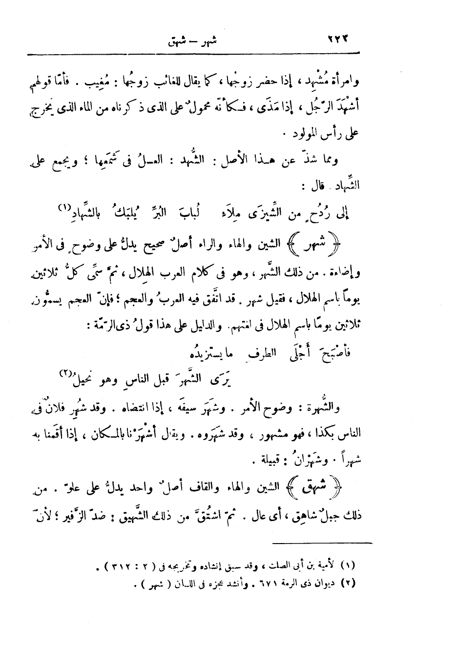 (شَهَرَ) الشِّينُ وَالْهَاءُ وَالرَّاءُ أَصْلٌ صَحِيحٌ يَدُلُّ عَلَى وُضُوحٍ فِي الْأَمْرِ وَإِضَاءَةٍ. مِنْ ذَلِكَ الشَّهْرِ، وَهُوَ فِي كَلَامِ الْعَرَبِ الْهِلَالُ، ثُمَّ سُمِّيَ كُلُّ ثَلَاثِينَ يَوْمًا بَاسِمِ الْهِلَالِ، فَقِيلَ شَهْرٌ. قَدِ اتَّفَقَ فِيهِ الْعَرَبُ وَالْعَجَمُ ; فَإِنَّ الْعَجَمَ يُسَمُّونَ ثَلَاثِينَ يَوْمًا بِاسْمِ الْهِلَالِ فِي لُغَتِهِمْ. وَالدَّلِيلُ عَلَى هَذَا قَوْلُ ذِي الرُّمَّةِ: