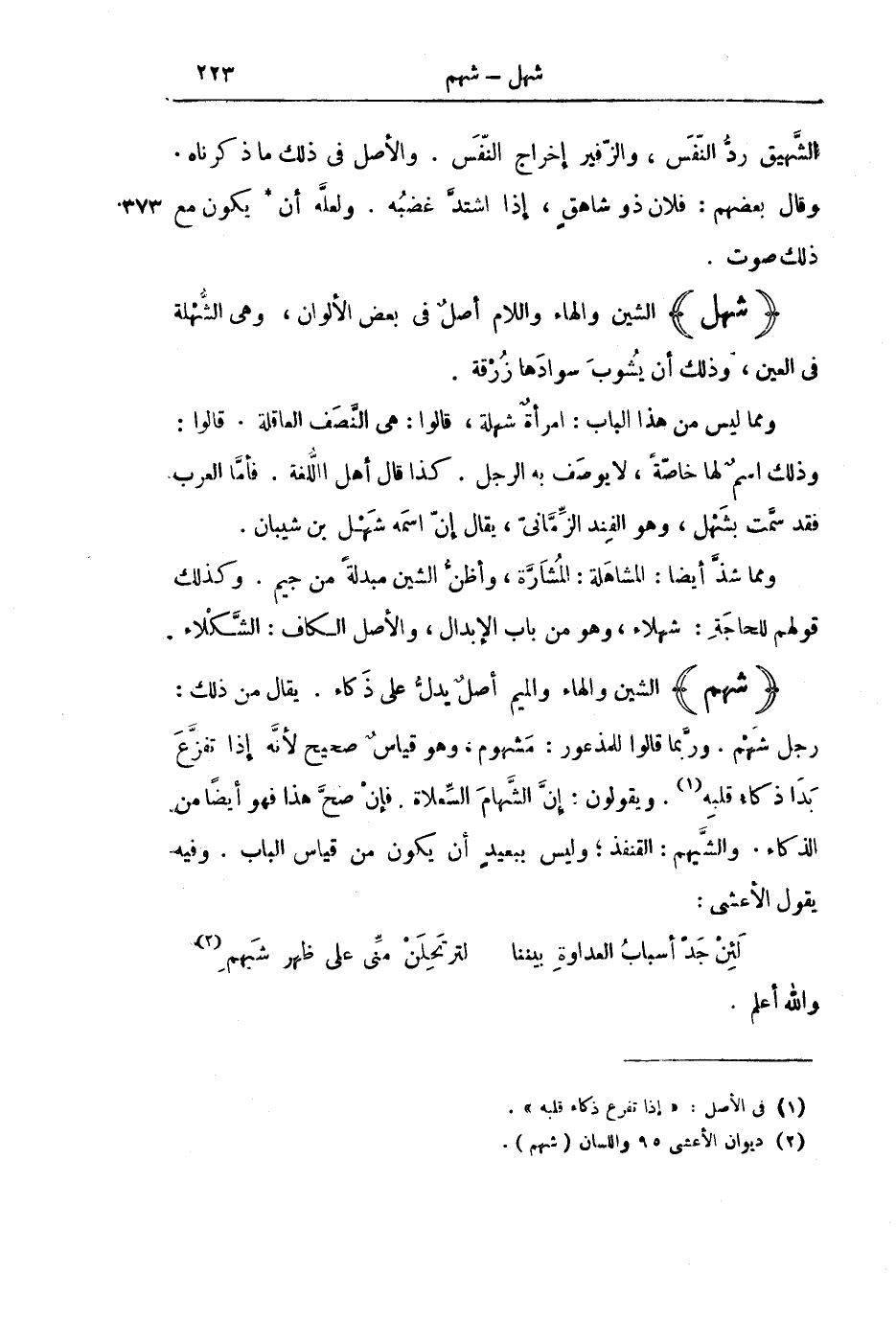 وَمِمَّا شَذَّ أَيْضًا: الْمُشَاهَلَةُ: الْمُشَارَّةُ، وَأَظُنُّ الشِّينَ مُبْدَلَةً مِنْ جِيمٍ. وَكَذَلِكَ قَوْلُهُمْ لِلْحَاجَةِ: شَهْلَاءُ، وَهُوَ مِنْ بَابِ الْإِبْدَالِ، وَالْأَصْلُ الْكَافُ: الشَّكْلَاءُ.