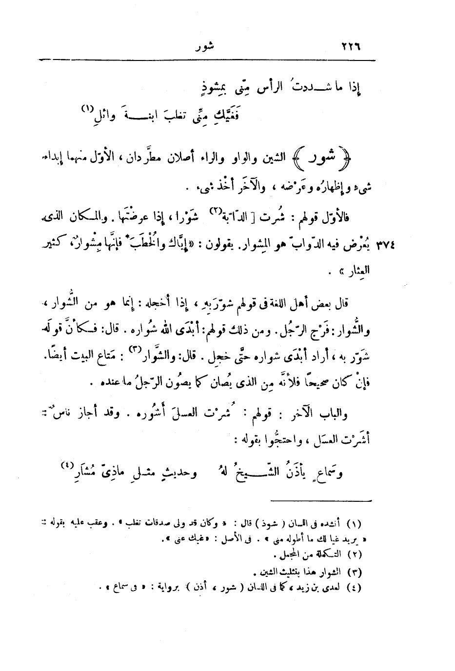 فَالْأَوَّلُ قَوْلُهُمْ: شُرْتُ [الدَّابَّةَ] شَوْرًا، إِذَا عَرَضْتَهَا. وَالْمَكَانُ الَّذِي يُعْرَضُ فِيهِ الدَّوَابُّ هُوَ الْمِشْوَارُ. يَقُولُونَ: " إِيَّاكَ وَالْخُطَبَ فَإِنَّهَا مِشْوَارٌ كَثِيرُ الْعِثَارِ ". قَالَ بَعْضُ أَهْلِ اللُّغَةِ فِي قَوْلِهِمْ شَوَّرَ بِهِ، إِذَا أَخْجَلَهُ: إِنَّمَا هُوَ مِنَ الشُّوَارِ، وَالشُّوَارُ: فَرْجُ الرَّجُلِ. وَمِنْ ذَلِكَ قَوْلُهُمْ: أَبْدَى اللَّهُ شُوَارَهُ. قَالَ: فَكَأَنَّ قَوْلَهُ شَوَّرَ بِهِ، أَرَادَ أَبْدَى شُوَارَهُ حَتَّى خَجِلَ. قَالَ: وَالشَّوَارُ: مَتَاعُ الْبَيْتِ أَيْضًا. فَإِنْ كَانَ صَحِيحًا فَلِأَنَّهُ مِنَ الَّذِي يُصَانُ كَمَا يَصُونُ الرَّجُلُ مَا عِنْدَهُ.