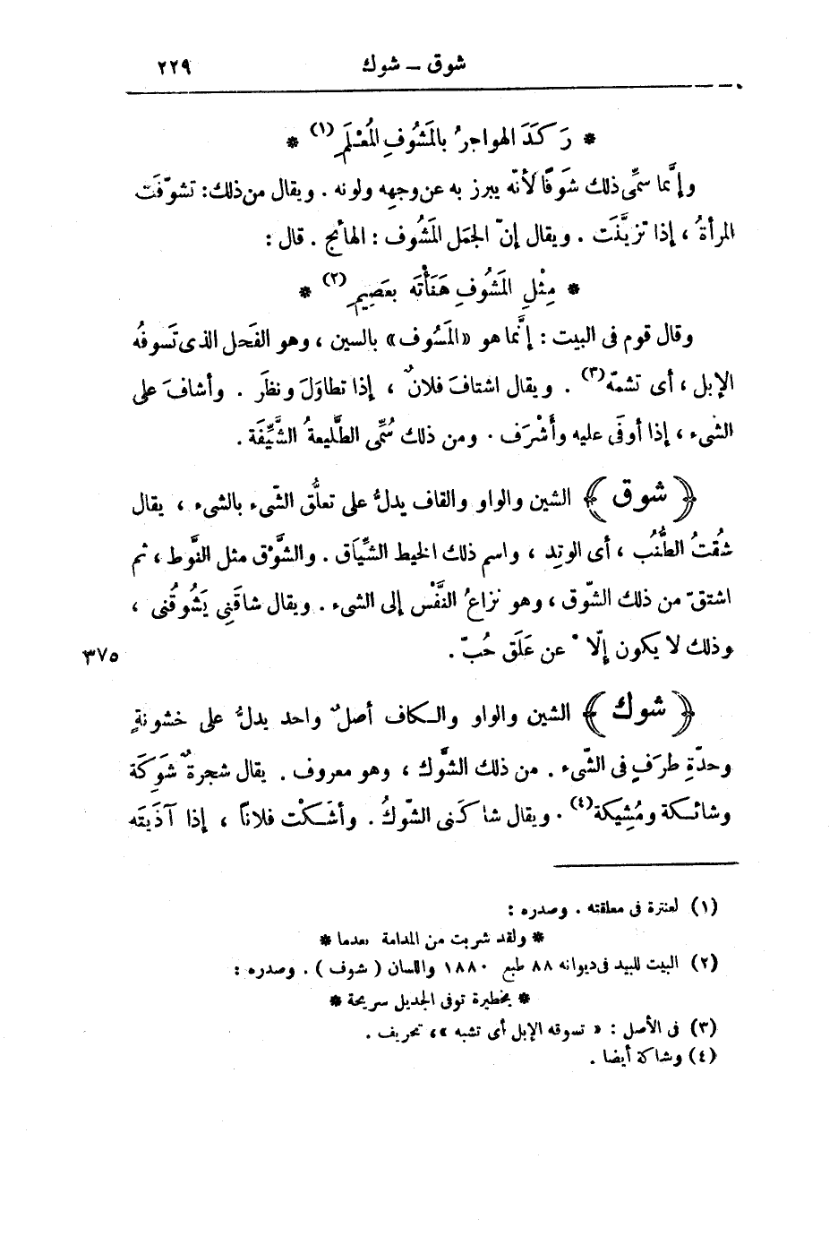 وَإِنَّمَا سُمِّيَ ذَلِكَ شَوْفًا لِأَنَّهُ يَبْرُزُ بِهِ عَنْ وَجْهِهِ وَلَوْنِهِ. وَيُقَالُ مِنْ ذَلِكَ: تَشَوَّفَتِ الْمَرْأَةُ، إِذَا تَزَيَّنَتْ. وَيُقَالُ إِنَّ الْجَمَلَ الْمَشُوفَ: الْهَائِجُ. قَالَ: