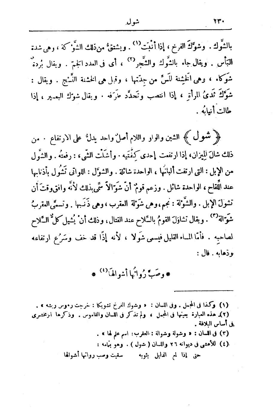 (شَوُلَ) الشِّينُ وَالْوَاوُ وَاللَّامُ أَصْلٌ وَاحِدٌ يَدُلُّ عَلَى الِارْتِفَاعِ. مِنْ ذَلِكَ شَالَ الْمِيزَانُ، إِذَا ارْتَفَعَتْ إِحْدَى كِفَّتَيْهِ. وَأَشَلْتُ الشَّيْءَ: رَفَعْتُهُ، وَالشَّوْلُ مِنَ الْإِبِلِ: الَّتِي ارْتَفَتْ أَلْبَانُهَا، الْوَاحِدَةُ شَائِلَةٌ. وَالشُّوَّلُ: اللَّوَاتِي تَشُولُ بِأَذْنَابِهَا عِنْدَ اللِّقَاحِ، الْوَاحِدَةُ شَائِلٌ. وَزَعَمَ قَوْمٌ أَنَّ شَوَّالًا سُمِّيَ بِذَلِكَ لِأَنَّهُ وَافَقَ وَقْتَ أَنْ تَشُولَ الْإِبِلُ.