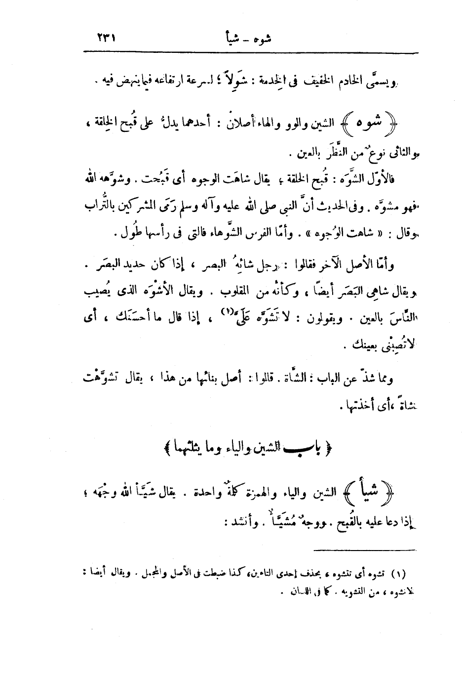 فَالْأَوَّلُ الشَّوَهُ: قُبْحُ الْخِلْقَةِ ; يُقَالُ شَاهَتِ الْوُجُوهُ أَيْ قَبُحَتْ. وَشَوَّهَهُ اللَّهُ فَهُوَ مُشَوَّهٌ. وَفِي الْحَدِيثِ أَنَّ النَّبِيَّ صَلَّى اللَّهُ عَلَيْهِ وَآلِهِ وَسَلَّمَ رَمَى الْمُشْرِكِينَ بِالتُّرَابِ وَقَالَ: «شَاهَتِ الْوُجُوهُ» . وَأَمَّا الْفَرَسُ الشَّوْهَاءُ فَالَّتِي فِي رَأْسِهَا طُولٌ.