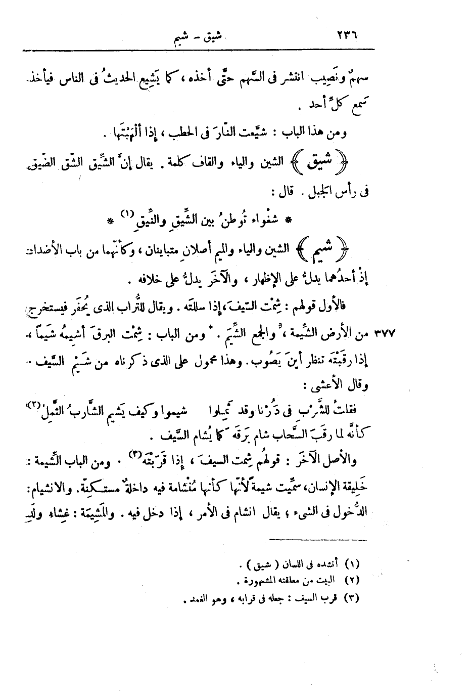 فَالْأَوَّلُ قَوْلُهُمْ: شِمْتُ السَّيْفَ، إِذَا سَلَلْتَهُ. وَيُقَالُ لِلتُّرَابِ الَّذِي يُحْفَرُ فَيُسْتَخْرَجُ مِنَ الْأَرْضِ الشِّيمَةُ، وَالْجَمْعُ الشِّيَمُ. وَمِنَ الْبَابِ: شِمْتُ الْبَرْقَ أَشِيمُهُ شَيْمًا، إِذَا رَقَبْتَهُ تَنْظُرُ أَيْنَ يَصُوبُ. وَهَذَا مَحْمُولٌ عَلَى الَّذِي ذَكَرْنَاهُ مِنْ شَيْمِ السَّيْفِ. وَقَالَ الْأَعْشَى: