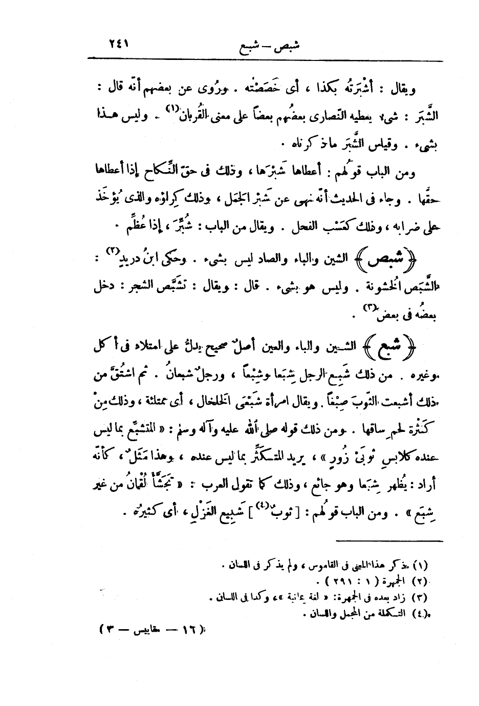 (شَبِعَ) الشِّينُ وَالْبَاءُ وَالْعَيْنُ أَصْلٌ صَحِيحٌ يَدُلُّ عَلَى امْتِلَاءٍ فِي أَكْلٍ وَغَيْرِهِ. مِنْ ذَلِكَ شَبِعَ الرَّجُلُ شِبَعًا وَشِبْعًا، وَرَجُلٌ شَبْعَانُ. ثُمَّ اشْتُقَّ مِنْ ذَلِكَ أَشْبَعْتُ الثَّوْبَ صِبْغًا. وَيُقَالُ: امْرَأَةٌ شَبْعَى الْخَلْخَالِ، أَيْ مُمْتَلِئَةٌ، وَذَلِكَ مِنْ كَثْرَةِ لَحْمِ سَاقِهَا. وَمِنْ ذَلِكَ قَوْلُهُ - صَلَّى اللَّهُ عَلَيْهِ وَآلِهِ وَسَلَّمَ -: «الْمُتَشَبِّعُ بِمَا لَيْسَ عِنْدَهُ كَلَابِسِ ثَوْبَيْ زُورٍ» ، يُرِيدُ الْمُتَكَثِّرَ بِمَا لَيْسَ عِنْدَهُ، وَهَذَا مَثَلٌ، كَأَنَّهُ أَرَادَ: يُظْهِرُ شِبَعًا وَهُوَ جَائِعٌ، وَذَلِكَ كَمَا تَقُولُ الْعَرَبُ: " تَجَشَّأَ لُقْمَانُ مِنْ غَيْرِ شِبَعٍ ". وَمِنَ الْبَابِ قَوْلُهُمْ: [ثَوْبٌ] شَبِيعُ الْغَزْلِ، أَيْ كَثِيرُهُ.