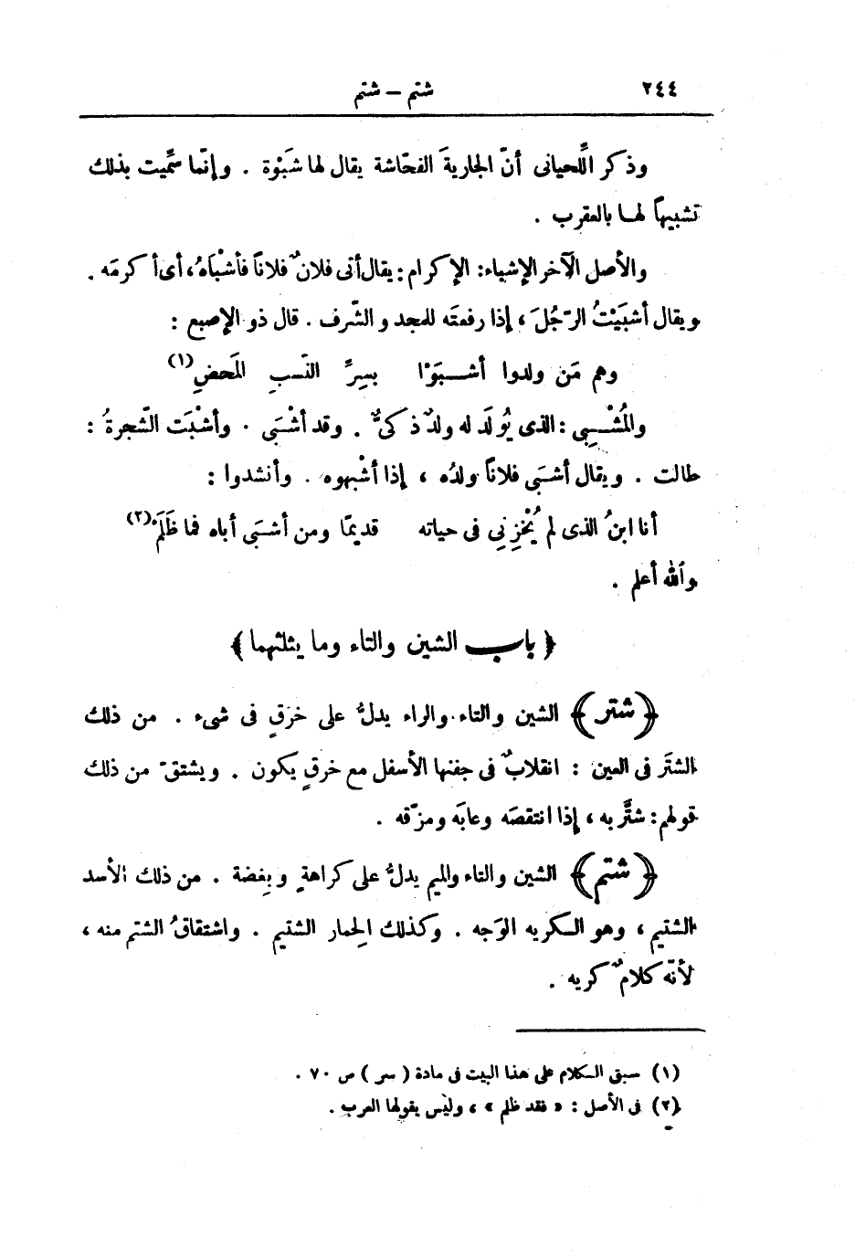 (شَتَمَ) الشِّينُ وَالتَّاءُ وَالْمِيمُ يَدُلُّ عَلَى كَرَاهَةٍ وَبِغْضَةٍ. مِنْ ذَلِكَ الْأَسَدُ الشَّتِيمُ، وَهُوَ الْكَرِيهُ الْوَجْهِ. وَكَذَلِكَ الْحِمَارُ الشَّتِيمُ. وَاشْتِقَاقُ الشَّتْمِ مِنْهُ ; لِأَنَّهُ كَلَامٌ كَرِيهٌ.