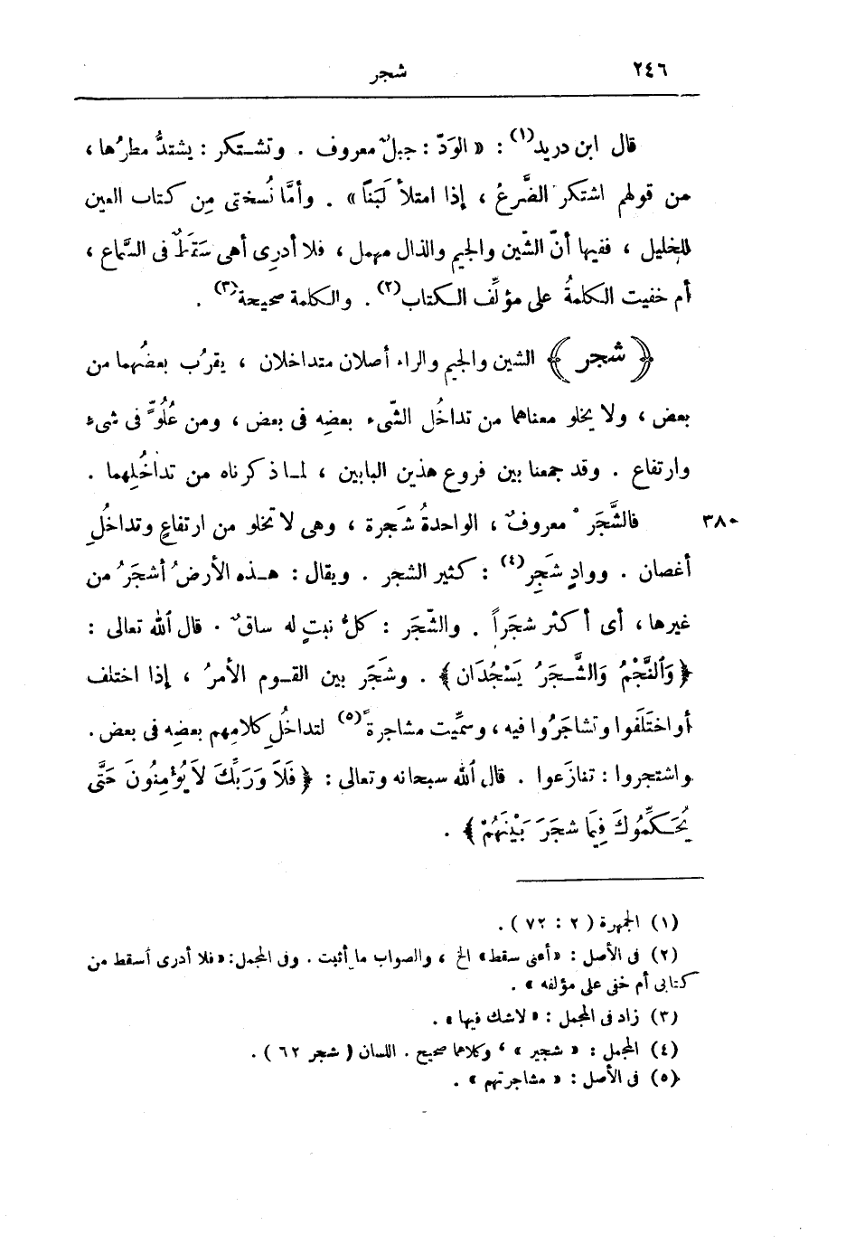 فَالشَّجَرُ مَعْرُوفٌ، الْوَاحِدَةُ شَجَرَةٌ، وَهِيَ لَا تَخْلُو مِنِ ارْتِفَاعٍ وَتَدَاخُلِ أَغْصَانٍ. وَوَادٍ شَجِرٌ: كَثِيرُ الشَّجَرِ. وَيُقَالُ: هَذِهِ الْأَرْضُ أَشْجَرُ مِنْ غَيْرِهَا، أَيْ أَكْثَرُ شَجَرًا. وَالشَّجَرُ: كُلُّ نَبْتٍ لَهُ سَاقٌ. قَالَ اللَّهُ تَعَالَى: {وَالنَّجْمُ وَالشَّجَرُ يَسْجُدَانِ} [الرحمن: 6] . وَشَجَرَ بَيْنَ الْقَوْمِ الْأَمْرُ، إِذَا اخْتَلَفَ أَوِ اخْتَلَفُوا وَتَشَاجَرُوا فِيهِ، وَسُمِّيَتْ مُشَاجَرَةً لِتَدَاخُلِ كَلَامِهِمْ بَعْضِهِ فِي بَعْضٍ. وَاشْتَجَرُوا: تَنَازَعُوا. قَالَ اللَّهُ سُبْحَانَهُ وَتَعَالَى: {فَلَا وَرَبِّكَ لَا يُؤْمِنُونَ حَتَّى يُحَكِّمُوكَ فِيمَا شَجَرَ بَيْنَهُمْ} [النساء: 65] .