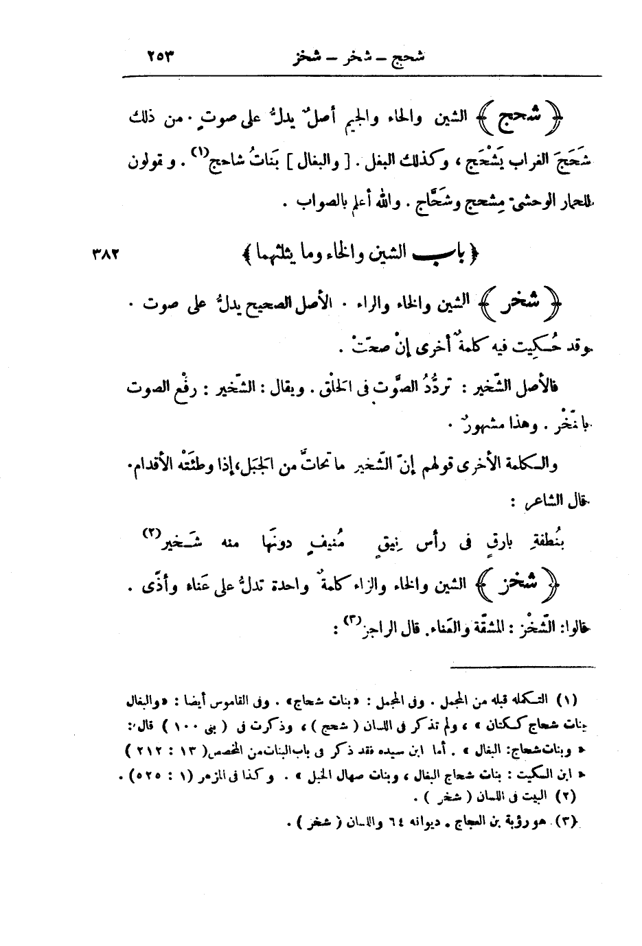 (شَحَجَ) الشِّينُ وَالْحَاءُ وَالْجِيمُ أَصْلٌ يَدُلُّ عَلَى صَوْتٍ. مِنْ ذَلِكَ شَحَجَ الْغُرَابُ يَشْحَجُ، وَكَذَلِكَ الْبَغْلُ. [وَالْبِغَالُ] بَنَاتُ شَاحِجٍ. وَيَقُولُونَ لِلْحِمَارِ الْوَحْشِيِّ: مِشْحَجٌ وَشَحَّاجٌ. وَاللَّهُ أَعْلَمُ بِالصَّوَابِ.