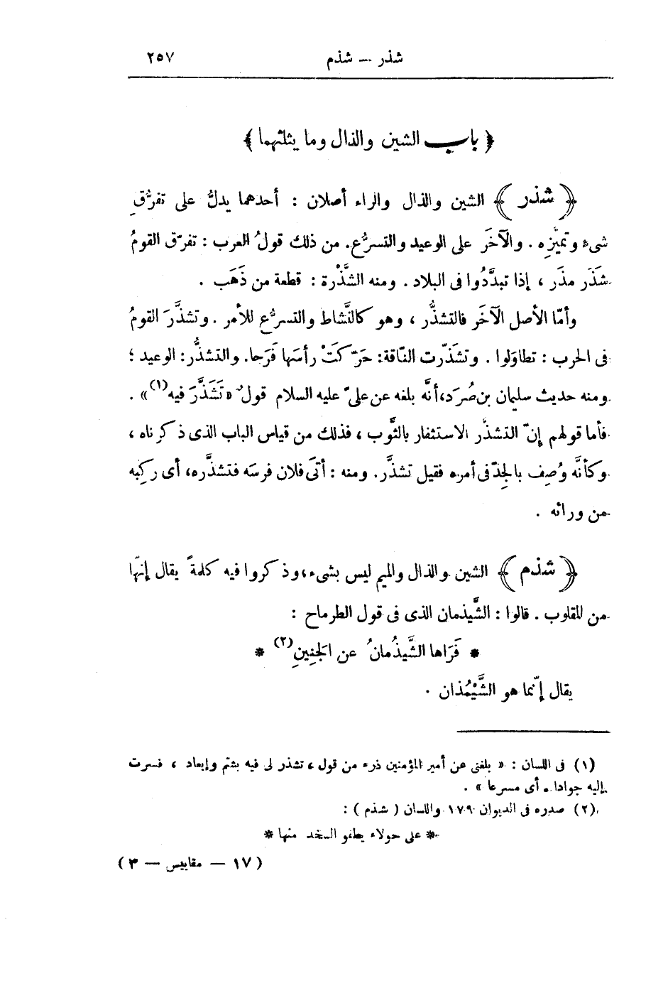 وَأَمَّا الْأَصْلُ الْآخَرُ فَالتَّشَذُّرُ، وَهُوَ كَالنَّشَاطِ وَالتَّسَرُّعِ لِلْأَمْرِ. وَتَشَذَّرَ الْقَوْمُ فِي الْحَرْبِ: تَطَاوَلُوا. وَتَشَذَّرَتِ النَّاقَةُ: حَرَّكَتْ رَأْسَهَا فَرَحًا. وَالتَّشَذُّرُ: الْوَعِيدُ ; وَمِنْهُ حَدِيثُ سُلَيْمَانَ بْنِ صُرَدٍ، أَنَّهُ بَلَغَهُ عَنْ عَلِيٍّ - عَلَيْهِ السَّلَامُ - قَوْلُ " تَشَذَّرَ فِيهِ ".